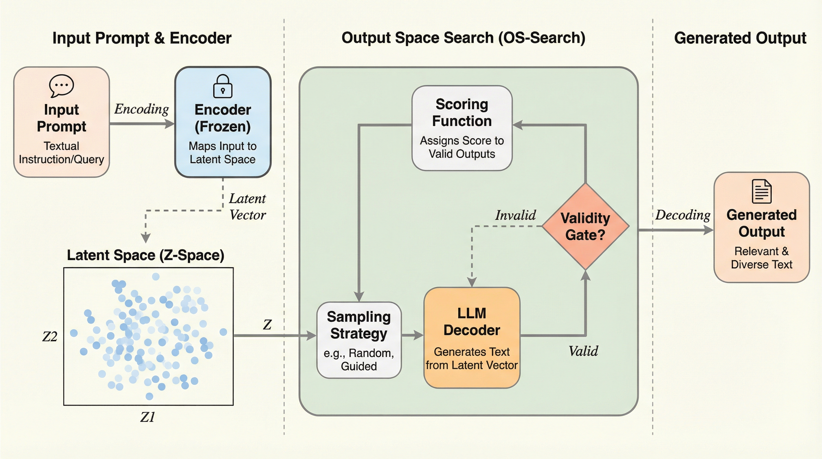 本論文が提案する「Output-Space Search(OS-Search)」は、表現と実行を完全にモジュール化した設計思想に基づいている。この手法の核心は、固定されたエンコーダによって定義される外部の出力空間Zと、その空間内の特定の座標を狙って生成を行うように訓練されたコントローラーの組み合わせにある。まず表現の側面では、凍結されたエンコーダと線形投影(PCAおよびVarimax回転)を用いて、タスクの出力に対する固定座標を定義する。これにより、高次元のテキスト空間が3次元の連続的な空間へと圧縮される。この3次元という低次元性は、人間や外部の最適化アルゴリズムが扱いやすいインターフェースとして機能する。次に実行の側面では、指定されたターゲット座標 z* に基づいて条件付けられた、検索グラウンディング(retrieval-grounded)ポリシーを訓練する。…