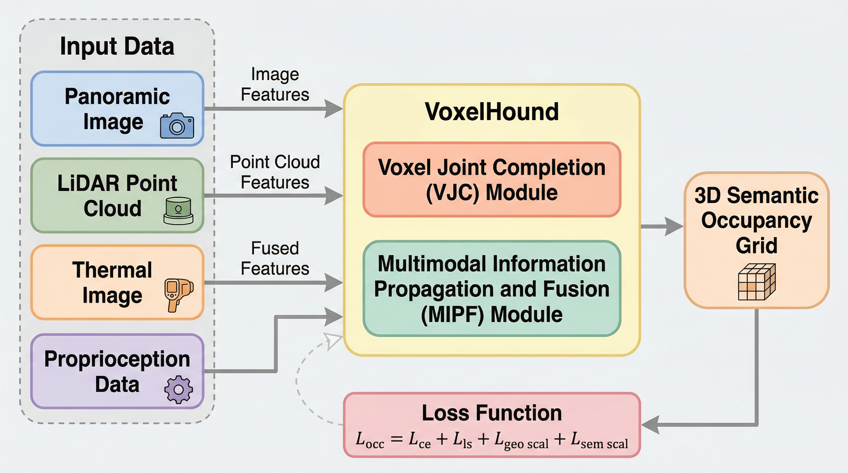 車載前提の占有予測は、低い視点、高い揺れ、遮蔽、照明変化が激しい四脚ロボット環境ではそのまま使いにくく、しかも全周画像と複数センサを同時に扱う実データ基盤が不足していました。 提案は二本立てで、まず 360 度パノラマ・LiDAR・熱・偏光をそろえた PanoMMOcc データセットを整備し、次に姿勢揺れ補償 VJC と情報融合 MIPF を備えた VoxelHound を導入しています。 PanoMMOcc 上で VoxelHound は 23.34% mIoU を達成し、同条件の比較法を上回りました。特に C+L+T+P の全モーダル構成は、照明変化や複雑な境界での頑健性を押し上げています。