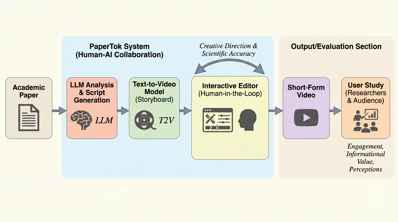 研究者が学術論文の内容をTikTokやInstagram Reelsのような短編動画へ変換する作業を支援するため、生成AIを活用した制作システム「PaperTok」が開発されました。 このシステムは、論文から脚本、音声、視覚的なストーリーボードを自動生成し、研究者が内容の正確性を維持しながら編集できる「人間とAIの協調ワークフロー」を提供することで、制作の負担を大幅に軽減します。 評価実験の結果、PaperTokで作成された動画は既存のツールよりも視聴者の関心を引きやすく、研究者にとっても専門知識を損なわずに魅力的な発信を行うための有効な手段であることが確認されました。