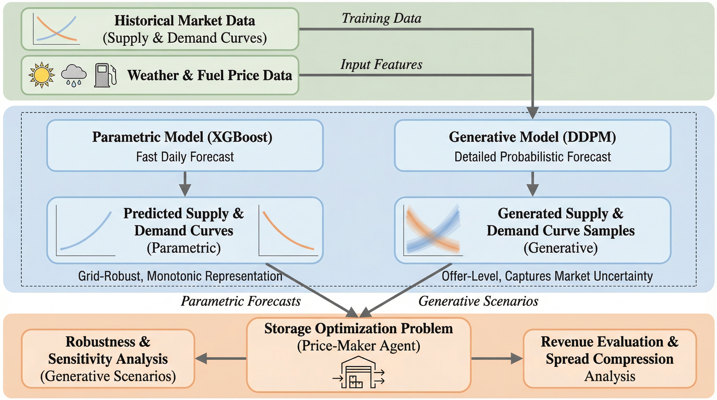 AIデータベース:電力市場曲線予測と蓄電池最適化のためのパラメトリック・生成モデルの統合