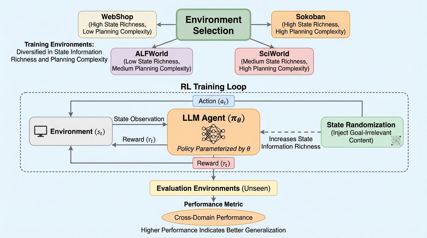 LLMエージェントを強化学習で訓練する際、学習した特定の環境には適応する一方で未知の環境での性能が低下する「汎化税」が大きな課題となっている。本研究では、4つの異なるエージェント環境を用いた詳細な分析を通じて、「状態情報の豊かさ」と「計画の複雑さ」という二つの環境特性が、未知のドメインへの汎化性能と強く相関することを突き止めた。 この知見に基づき、タスクの本質を変えずに状態情報へ少量の無関係なノイズを加える「状態ランダム化」手法を提案し、これが知覚的な堅牢性を高めて未知の領域での性能維持に有効であることを実証した。さらに、学習中にステップバイステップの思考を有効にすることが汎化において不可欠な役割を果たす一方で、教師あり微調整(SFT)によるウォームアップが学習ドメインの知識を固定し、未カバーのドメインへの汎化を阻害するというトレードオフを特定した。 最終的に、デプロイ先が不明な汎用エージェントを構築するための具体的な環境選定指針として、情報の密度が高く、長期的な推論を要求する環境での学習を推奨し、モデリング手法として明示的な推論プロセスと軽量な状態ランダム化の組み合わせを提示した。