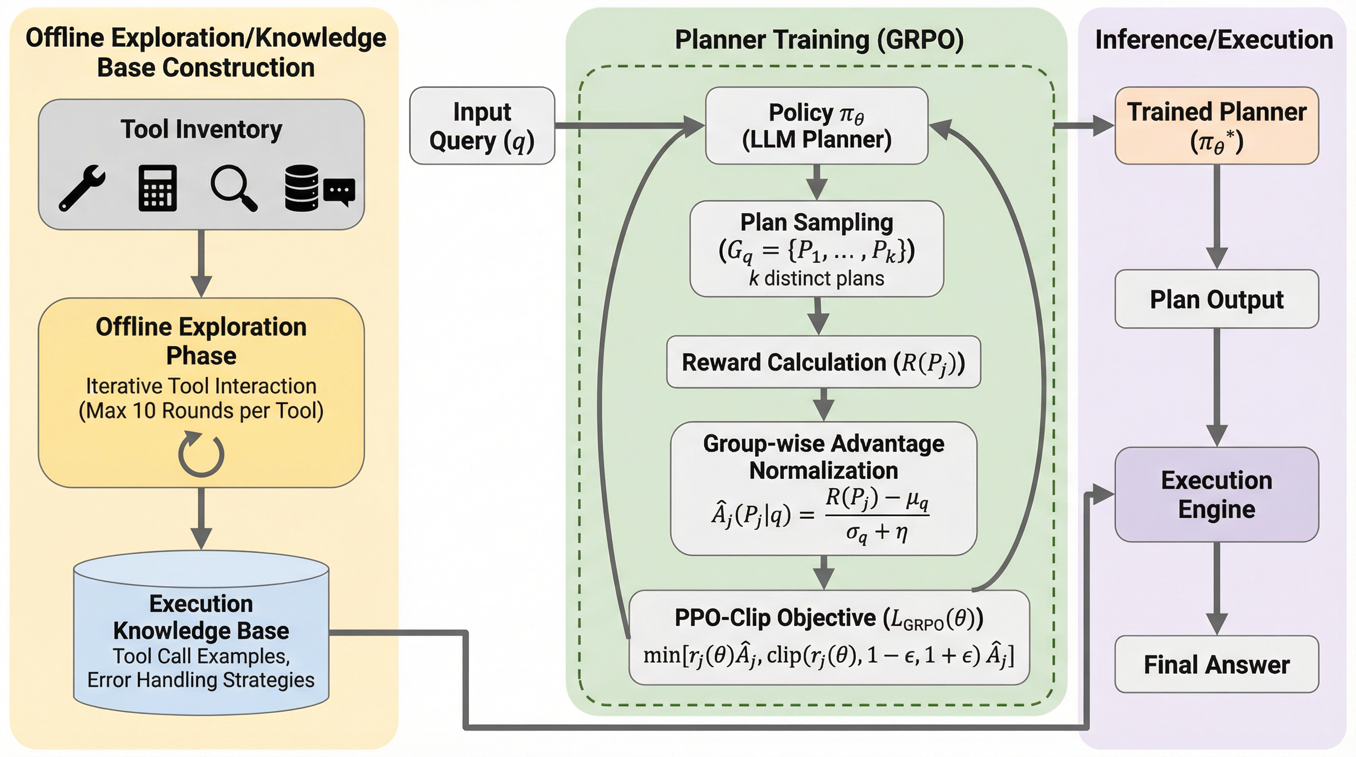 大規模言語モデルは自然言語の理解と生成において顕著な能力を示しているが、その知識は静的であり、訓練データに限定されているため、現実世界との相互作用や最新情報へのアクセス、複雑な計算の実行には限界がある。この制限を克服するために外部ツールを導入するツール学習が登場したが、初期の成功は単純な単一ステップのAPI呼び出しに留まっていた。現在の課題は、複数のツールを戦略的に順序立てて使用する必要がある複雑な多段階の問題解決へと移行している。しかし、この複雑性の飛躍により、エージェントの長期的な計画立案と堅牢な実行能力における重大なボトルネックが露呈している。 既存のアプローチの多くは、一歩先しか見ない近視眼的な戦略を採用しており、長期的な計画を策定したり遵守したりすることが困難である。このような先見性の欠如は、存在しないツールを捏造するツールの幻覚や、誤ったパラメータの生成、連続するツール呼び出し間の依存関係の管理失敗といった、脆弱で信頼性の低い実行につながる。さらに、実行エラーに直面した際の適応能力も乏しく、失敗を診断して計画を反映させ、戦略を動的に調整することができず、同じ失敗を繰り返すループに陥ることが多い。…