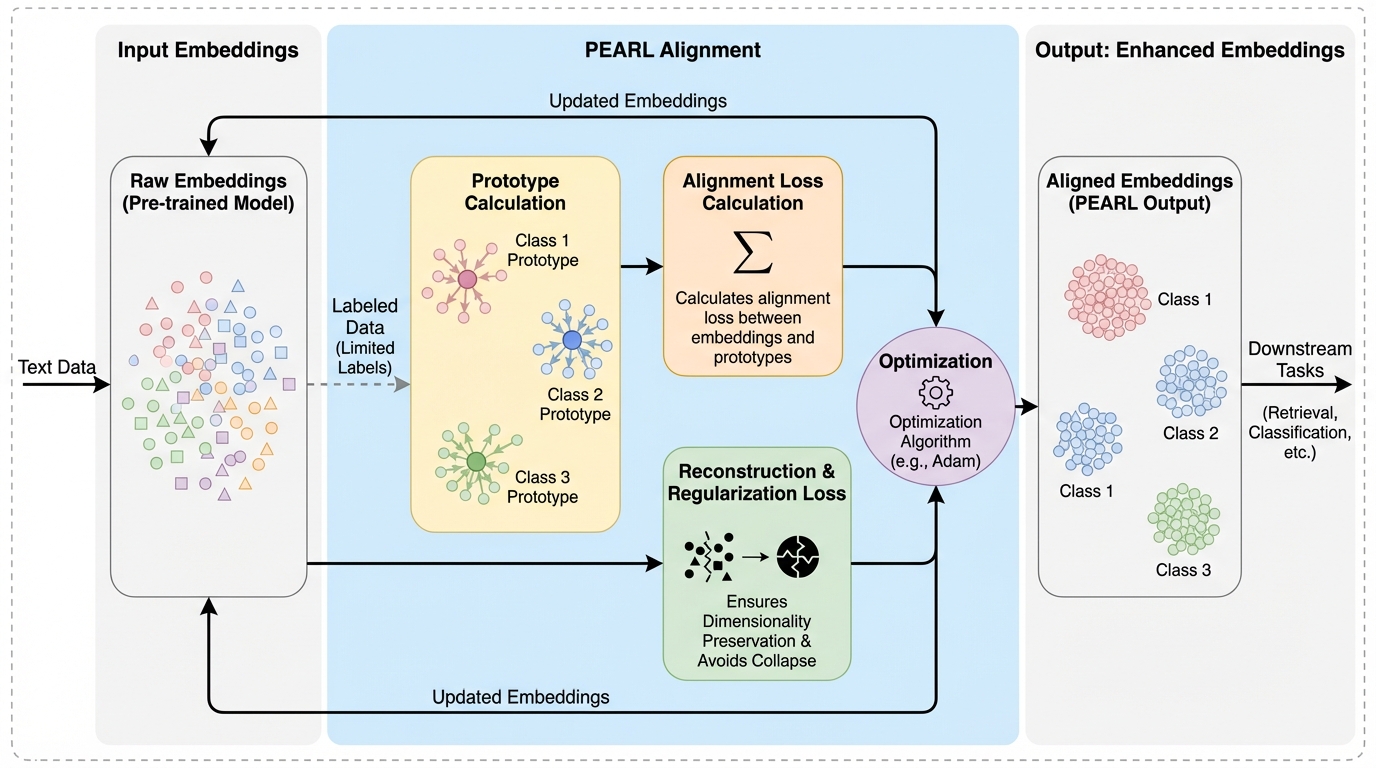 デジタルガバナンス等の実運用システムでは、固定された埋め込み表現の近傍構造が不正確で誤った事例を検索してしまう課題があるが、本研究が提案するPEARLは、限られたラベル情報を用いて埋め込みをクラスプロトタイプに軟らかく整列させることで、次元数を維持したまま近傍の幾何学的構造を劇的に改善する。