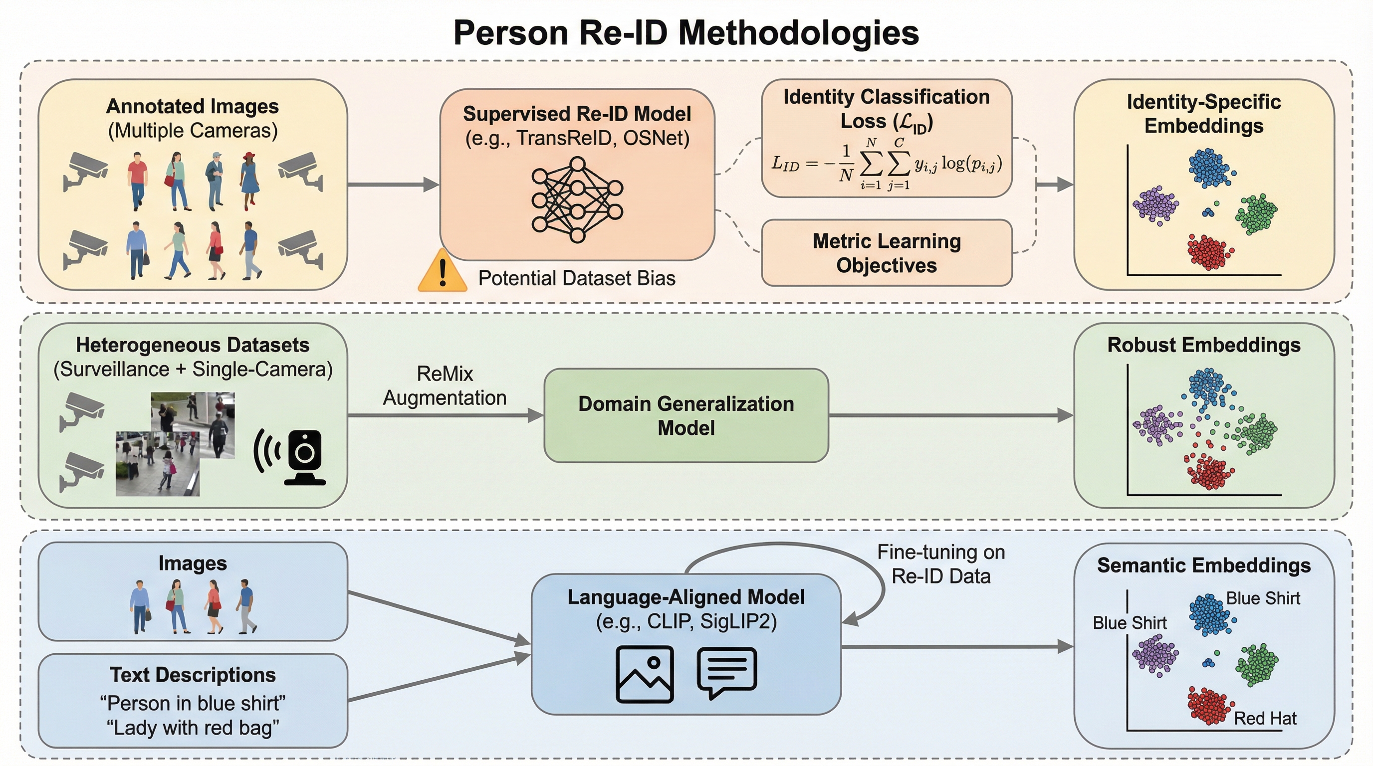 本研究は2025年時点の人物再識別(Person Re-ID)における「教師あり学習」「自己教師あり学習」「言語アライメント」の3つの主要な学習パラダイムを、11種類のモデルと9種類の多様なデータセットを用いて包括的に評価したものである。