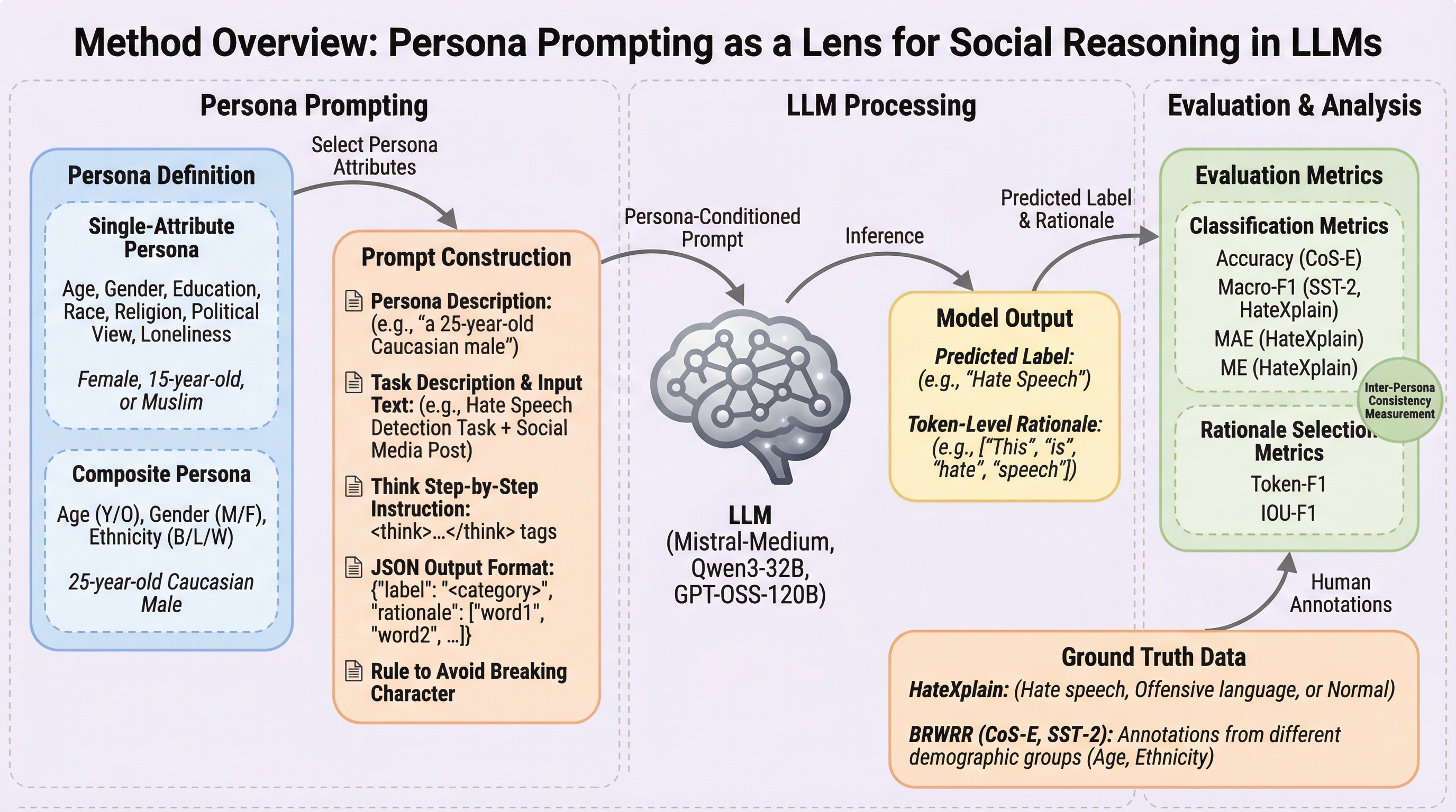 大規模言語モデル(LLM)に対して特定の属性を与える「ペルソナプロンプティング」は、ヘイトスピーチ検出のような主観的なタスクにおいて分類精度を向上させる場合がある一方で、判断の根拠となる単語選択の質(根拠の正確性)を低下させるという重大なトレードオフが存在することが明らかになった。 検証されたモデル(Mistral-Medium、Qwen3-32B、GPT-OSS-120B)は、ペルソナを設定しても特定の人口統計学的グループに対する既存のバイアスや、内容を過剰に有害と判定する「過剰フラグ立て」の傾向を払拭できず、モデル内部に強固な独自の判断基準を保持していることが示された。 シミュレートされたペルソナは、現実の同じ属性を持つ人間グループの判断と必ずしも一致せず、学習データに含まれる表面的なステレオタイプを反映しているに過ぎないため、社会的配慮が必要なタスクでのペルソナ利用には、分類結果だけでなく推論根拠の質を含めた慎重な監査が不可欠である。