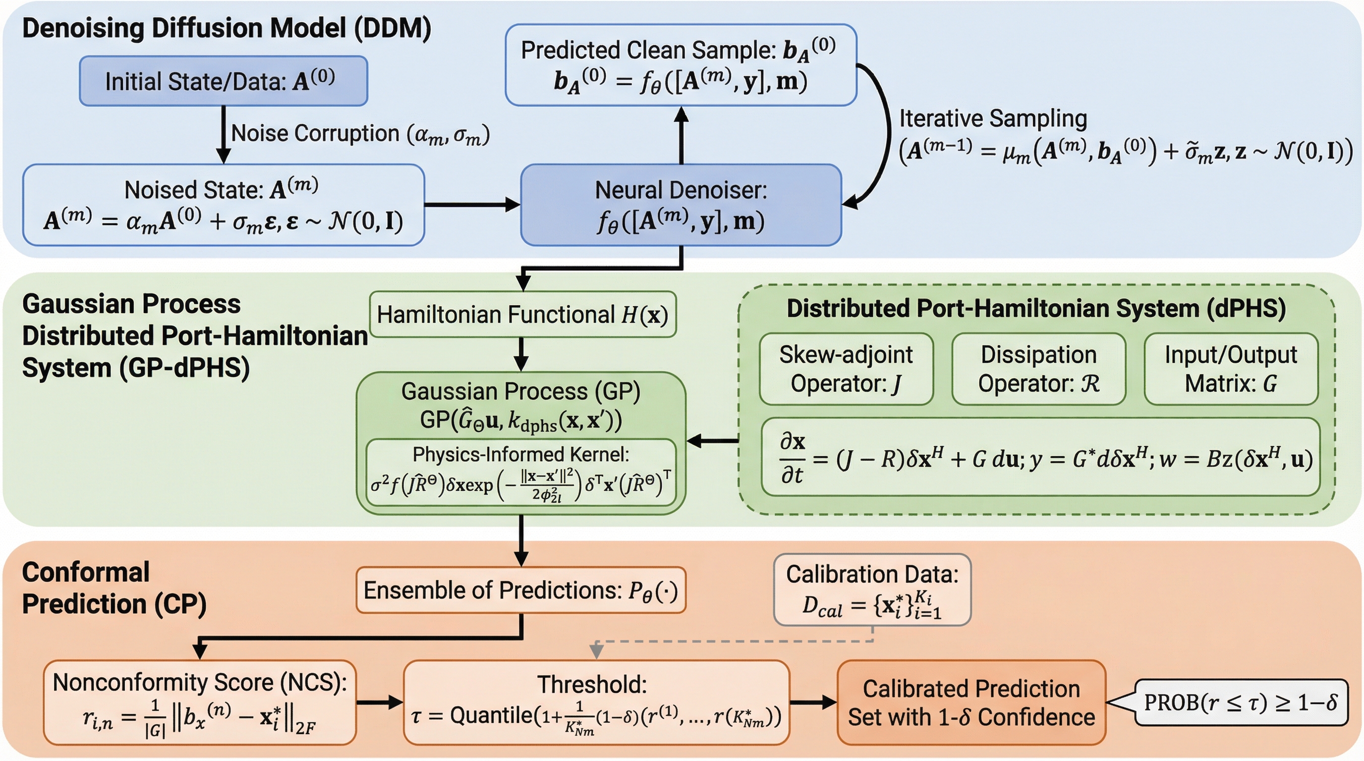 複雑な動的システムの予測において、従来の物理情報に基づく機械学習は明示的な支配方程式を必要としていたが、本研究では方程式が未知または不完全な場合でも適用可能なPHDMEという新しい拡散モデルの枠組みを提案している。 この手法はガウス過程分散ポート・ハミルトン系(GP-dPHS)を用いて、限られた観測データからシステムのエネルギーベースの表現を学習し、その物理的構造を拡散モデルの学習プロセスに統合することで、データの希少性と物理的な整合性の両立を実現している。 学習された拡散モデルは高速な軌道生成を可能にするアモータイズド・サンプラーとして機能し、さらにコンフォーマル予測を適用することで生成された予測値に対して統計的な不確実性の保証を提供し、実世界のバネシステムや偏微分方程式のベンチマークで高い精度を示している。