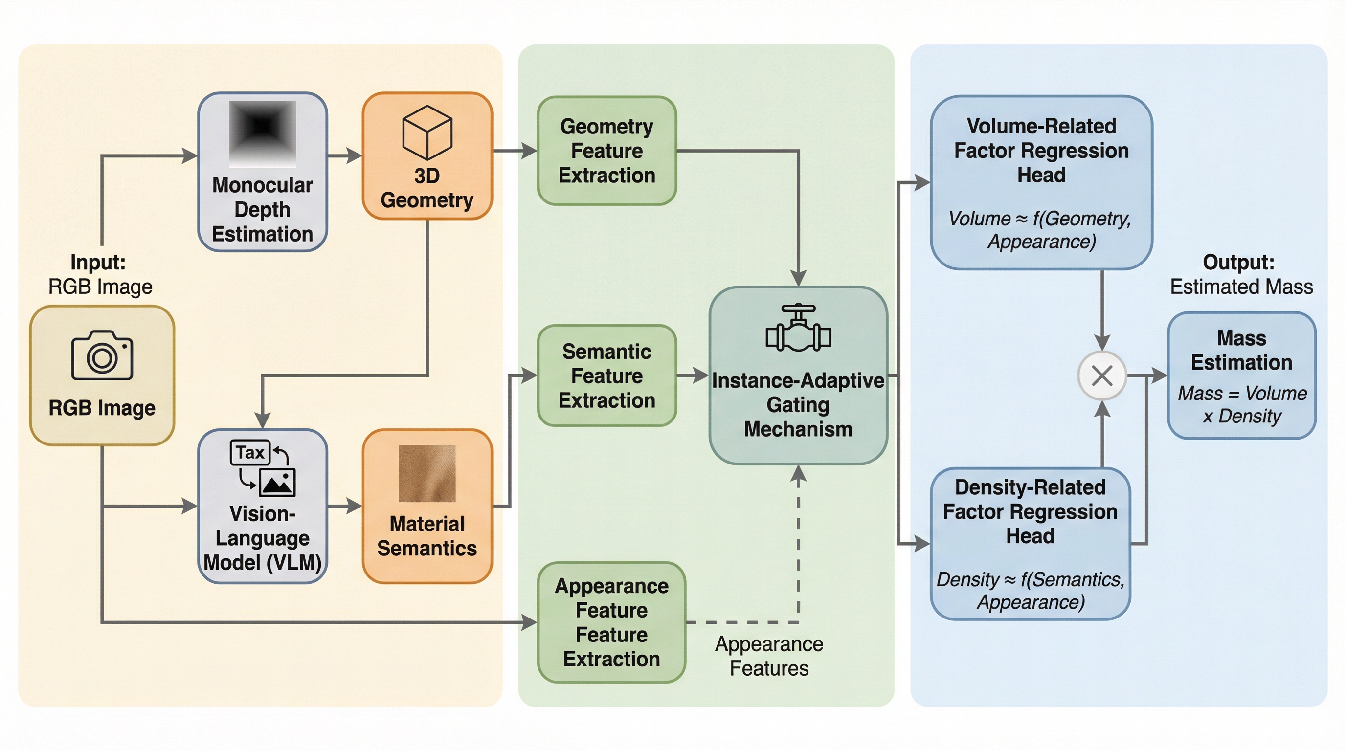 本研究の核心は、質量が体積と密度の積であるという基本的な物理的関係に基づき、視覚的な手がかりをそれぞれの物理的要因に明示的に整合させる「物理構造化フレームワーク」を提案した点にある。具体的には、単一のRGB画像から得られる情報を「外観」「幾何学」「セマンティクス」という3つの独立した要素に分解し、それらを物理的な役割に応じて統合する設計を採用した。まず、単眼深度推定を通じて得られた3次元幾何学情報を体積に関連する要因の推論に割り当て、視覚言語モデル(VLM)から得られた材料のセマンティクス情報を密度に関連する要因の推論に割り当てる。このように、各物理的要因をそれを説明するのに最も適した視覚的証拠と結びつけることで、単一画像特有の情報の曖昧さを解消しようとしている。 提案手法では、これらの幾何学的、意味的、および外観の表現を、インスタンス適応型のゲートメカニズムを介して融合する。…