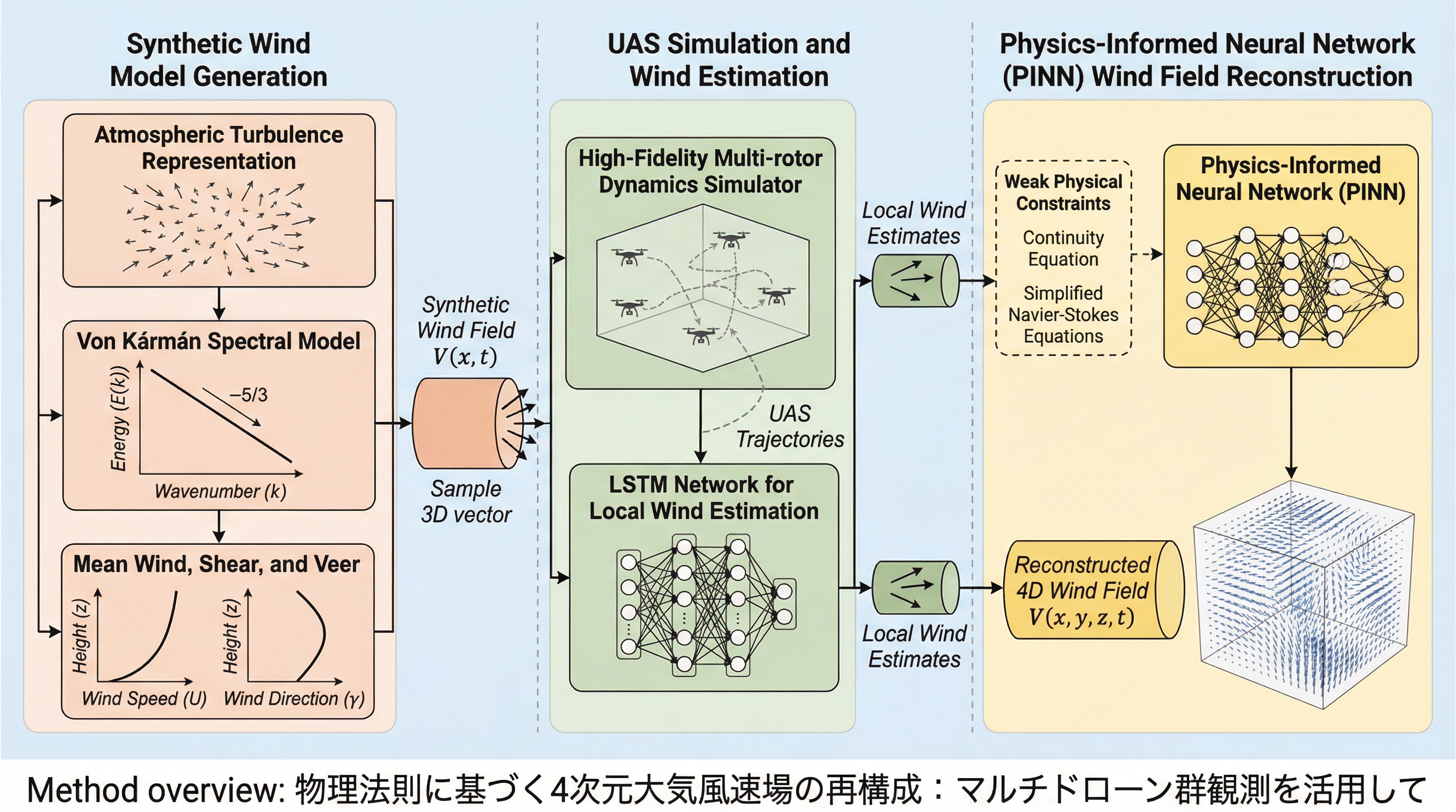 大気風速場が空間や時間とともにどのように変化するかを正確に理解することは、数値天気予報、嵐の被害評価、風力エネルギーの評価など、幅広い大気科学および工学アプリケーションにとって極めて重要である。特に強い風が頻繁に発生する地域は、激しい嵐や竜巻などの影響を受けやすく、公共の安全とインフラ計画の両面で風速場の正確な特性評価が求められている。しかし、既存の観測手段には大きな制約が存在する。ドップラー風速リレーダー(DWL)や気象タワー、風速計などは貴重なデータを提供するが、配備コストや運用上の制約があり、高度数百メートルを超えると観測範囲が急速に減少してしまう。その結果、下層大気境界層(ABL)の大部分は、空間的および時間的な観測データがまばらな状態に留まっている。 無人航空機システム(UAS)は、高解像度の現地観測を低コストかつ柔軟に提供できる補完的なプラットフォームとして注目されている。しかし、単一のUASによる観測は飛行軌道上に限定されるため、機体周辺の広範な3次元構造を明らかにすることは困難である。…