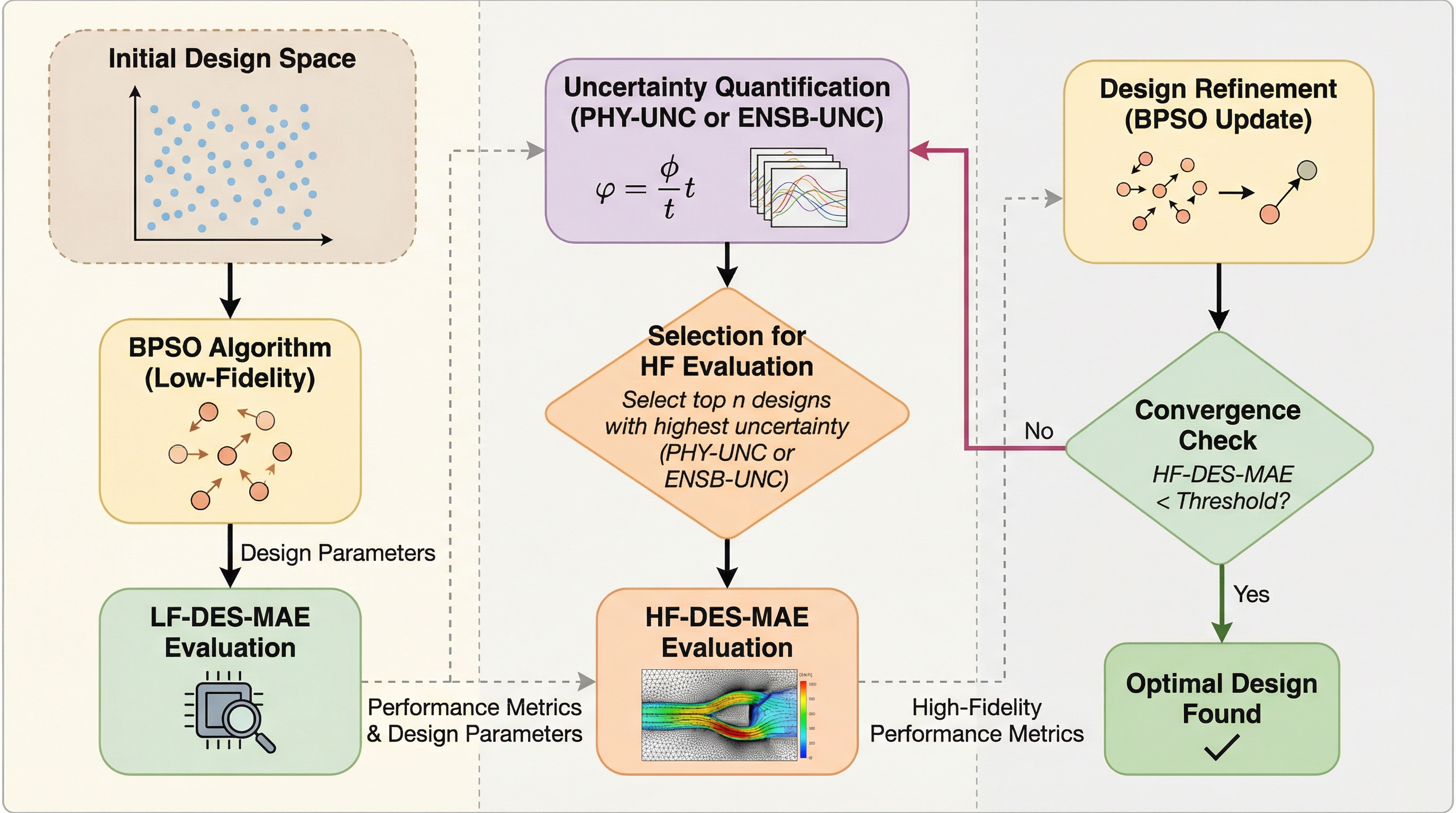 次世代通信(5G/6G)に不可欠なメタサーフェス設計において、従来のAI代理モデルは学習データが不足する領域で「偽の最適解」を提示する課題がありましたが、本研究は予測が物理法則(電磁場の連続性)にどれだけ違反しているかを不確実性の指標とする「物理法則に基づく不確実性(PHY-UNC)」を提案しました。 この指標を多目的最適化ワークフローに統合することで、電磁波の透過特性を制御する複雑な表面設計の成功率を従来の10%未満から50%以上に向上させ、同時に計算コストをフルウェーブシミュレーションのみを用いる場合と比較して10分の1に削減することに成功しました。 統計的な手法に頼らず、物理的原理をモデルの信頼性評価に直接活用することで、高次元な設計空間においても効率的かつ堅牢に最適な構造を探索できる自律的な科学的発見システムの基盤を構築し、AIと物理学の融合が設計の信頼性を劇的に高めることを実証しました。
