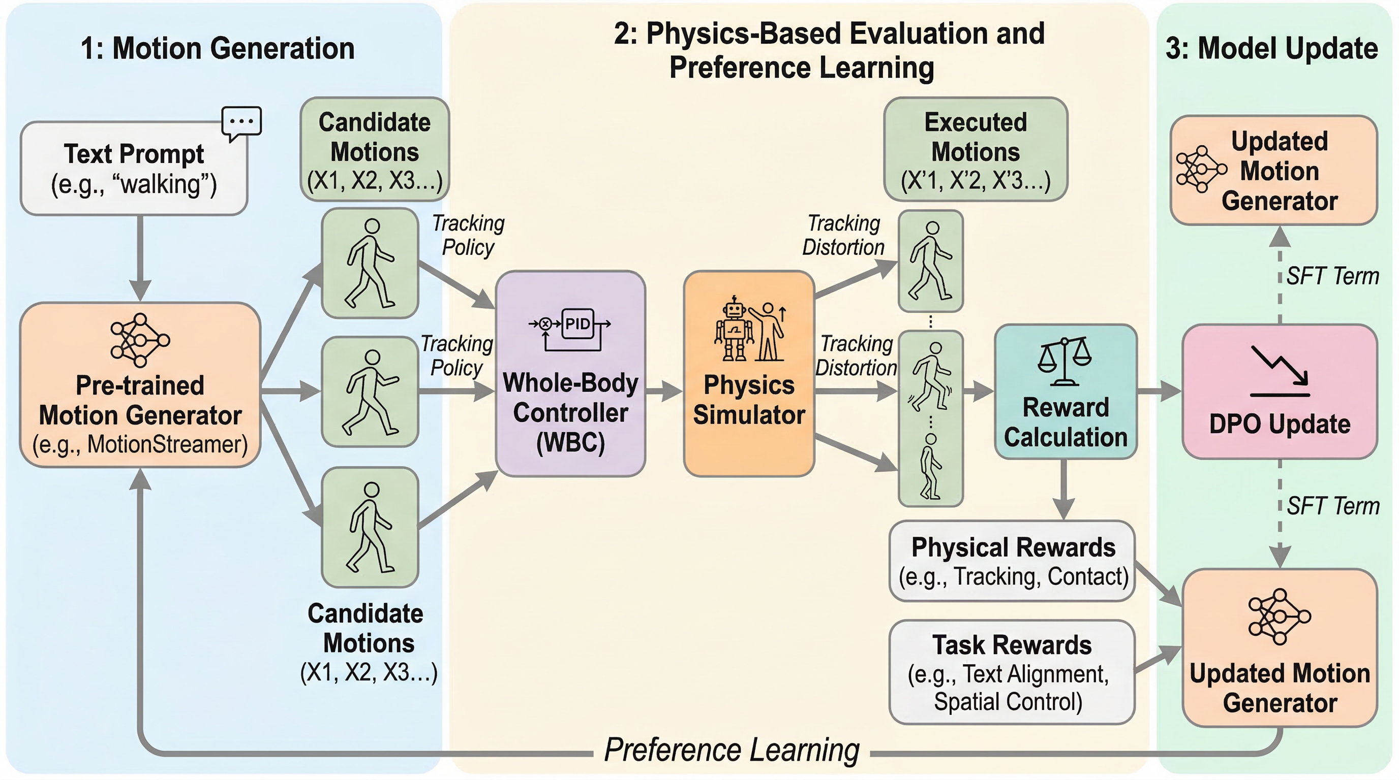 中心提案は PhysMoDPO です。拡散型のモーション生成器から複数の候補動作をサンプルし、それぞれを固定の Whole-Body Controller で物理シミュレータ上の実行可能軌道へ写像し、その結果に対して選好を付けてDPOで後学習します。ここで選好を決めるのは、追従のしやすさや接触の自然さのような物理報酬と、追従後にもテキストや空間条件を満たしているかを見るタスク報酬の組み合わせです。