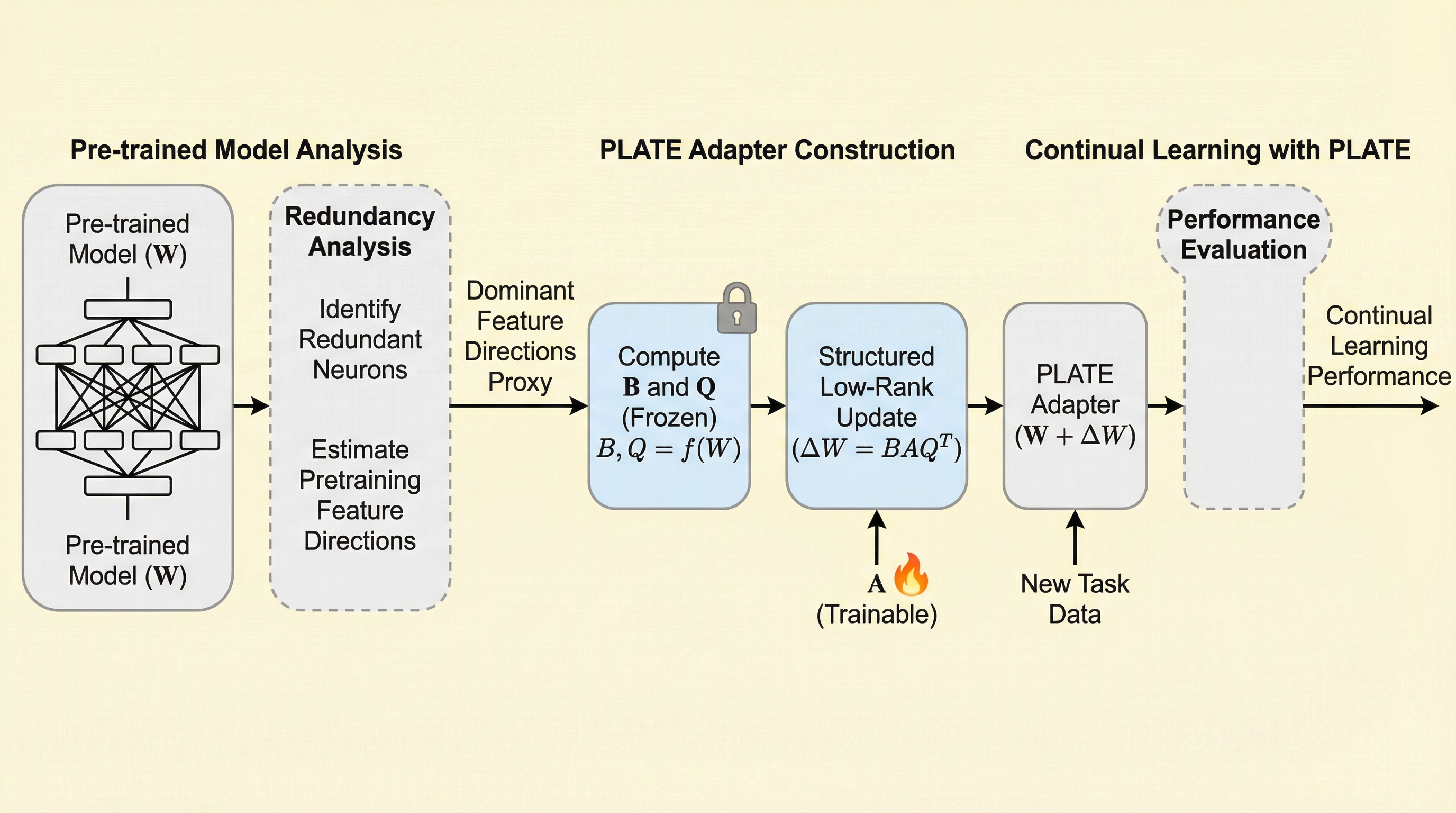 提案の中心は PLATE(Plasticity-Tunable Efficient Adapters for Geometry-Aware Continual Learning)です。名前が示す通り、焦点は「可塑性(plasticity)」を調整可能にしつつ、「効率的なアダプタ(efficient adapters)」として実装し、さらに「幾何(geometry)」に基づいて継続学習を扱うところにあります。ここで“幾何”という言葉が前に出ているのは、保持や忘却を、データ上の損失だけでなく、重み空間の構造として捉え直したい、という姿勢の表れとして読めます。