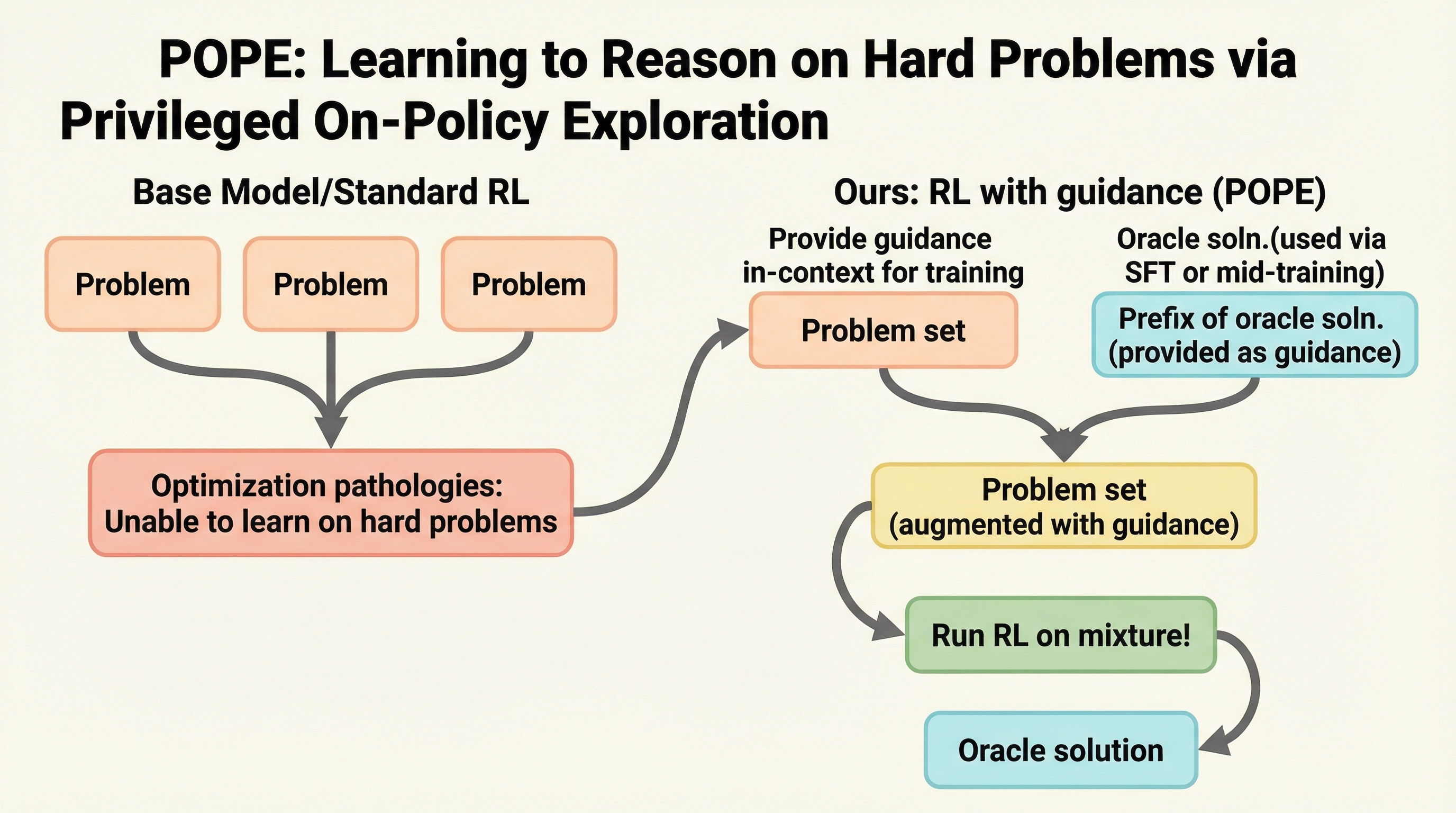 本研究は、困難な問題における探索を劇的に改善するための新しい枠組みとして「特権的オンポリシー探索(Privileged On-Policy Exploration:POPE)」を提案しました。POPEの核心的なアイデアは、人間やオラクルが作成した正解の一部を「特権的な情報」としてモデルに与え、それを手がかりとしてモデル自身の力で正解までたどり着かせるという点にあります。具体的には、困難な問題のプロンプトに対して、正解に至る思考プロセスの最初の数ステップ(接頭辞)を付加します。これにより、モデルはゼロから正解を探すのではなく、与えられた正しい文脈の上で推論を継続することができるようになります。…