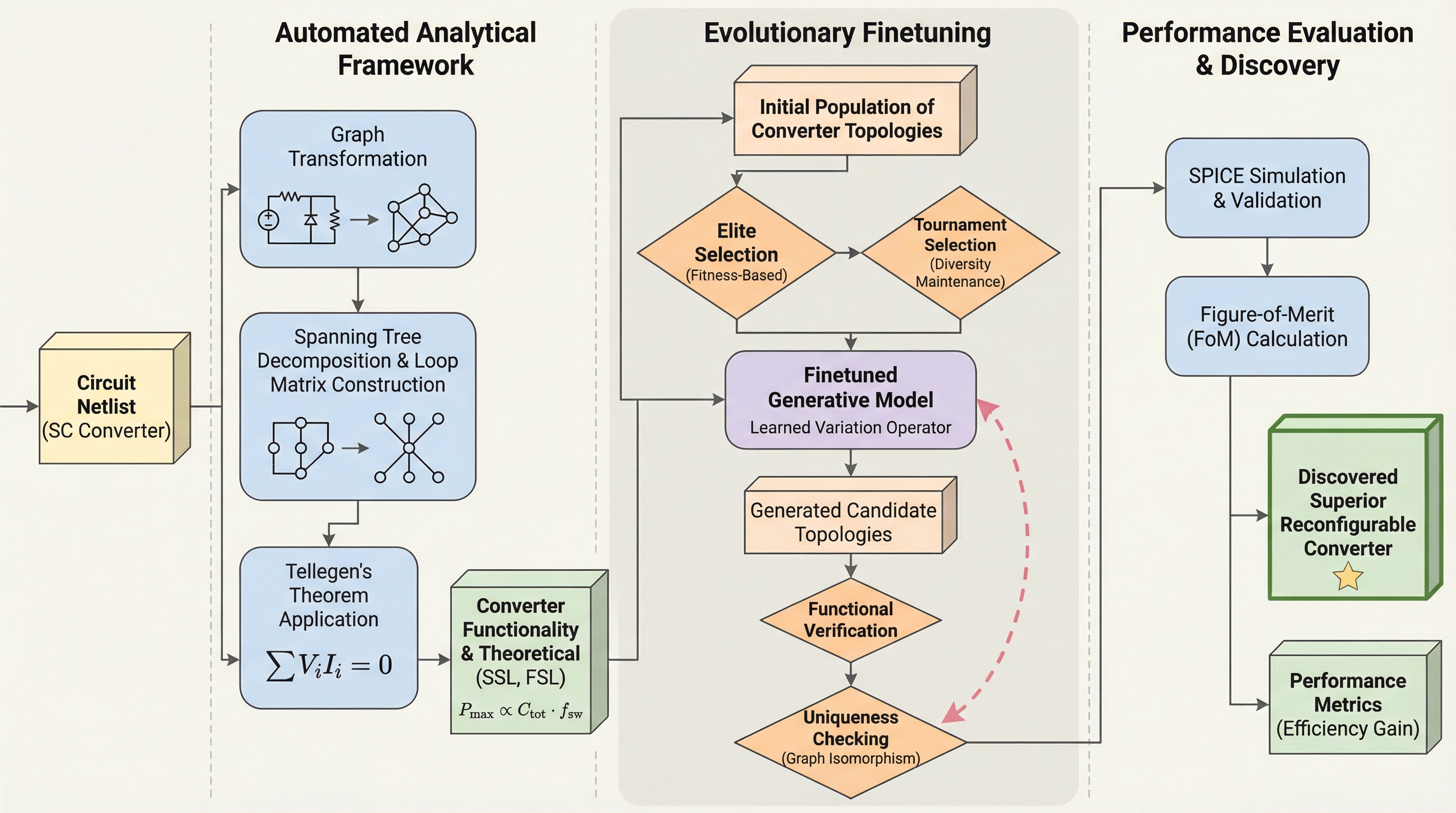 PowerGenieは、膨大な設計空間から高性能な再構成可能電力コンバータを自動発見するために開発された、解析的ガイド付きの新しいAIフレームワークである。 この手法は、グラフ理論とテリガンの定理に基づき、時間のかかるSPICEシミュレーションを介さずに回路の機能と理論的性能限界を数秒で特定する自動解析手法と、生成モデルと学習データを共に洗練させる進化的微調整を導入している。 結果として、従来の最高性能を23%上回る性能指数を持つ未知の8モード電力コンバータの発見に成功し、実機シミュレーションにおいて全モード平均で10%、最大で17%の効率向上を達成するという画期的な成果を収めた。