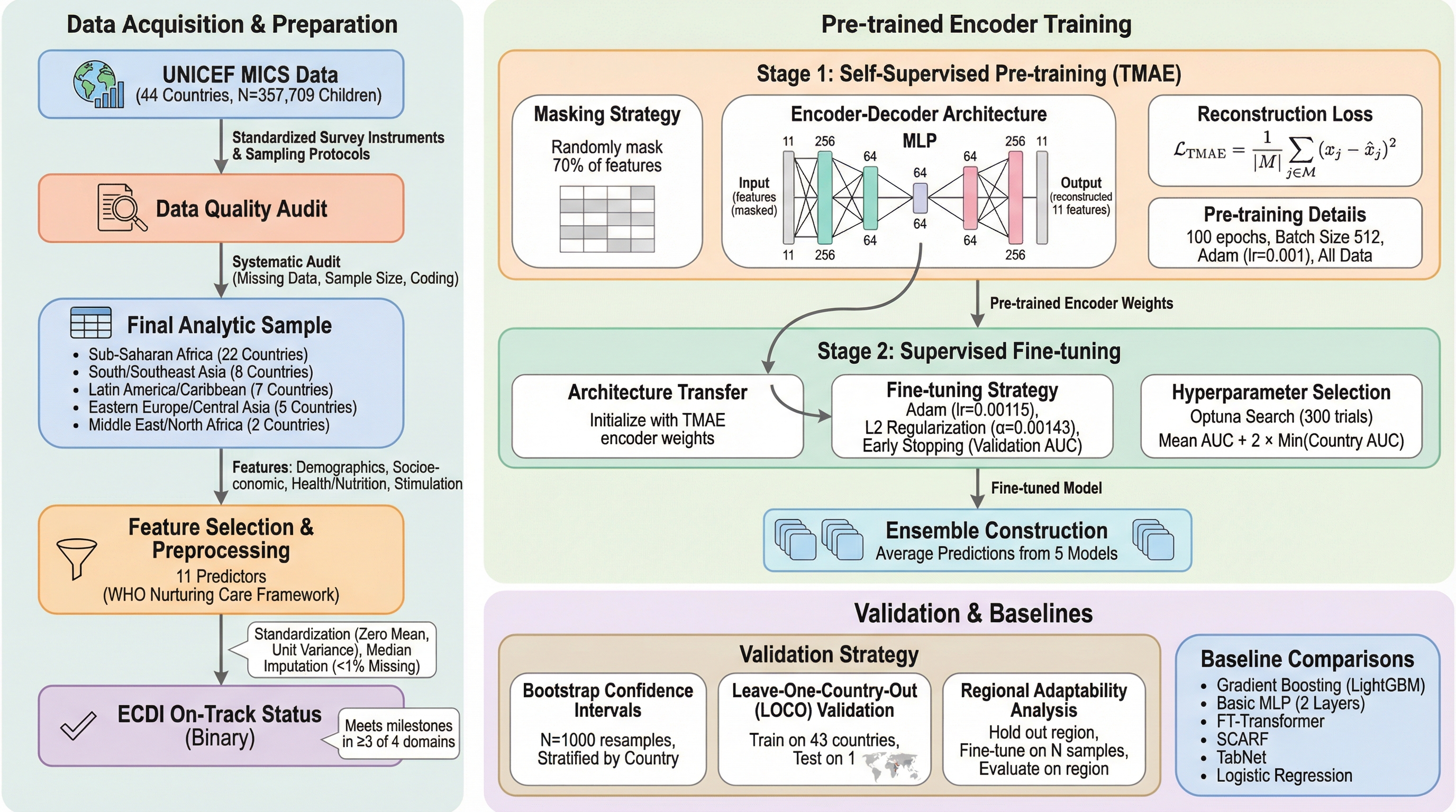 本研究の核心は、世界の子どもの発達に関する「普遍的な知識」を学習した、世界初の子どもの発達専用の事前学習済みエンコーダの提案です。このモデルは、ユニセフ(UNICEF)が実施した第6回複数指標クラスター調査(MICS)のデータを利用し、44カ国にわたる35万7,709人の子どもの情報を学習しています。この膨大なデータセットには、サハラ以南のアフリカ、南・東南アジア、ラテンアメリカ・カリブ海諸国、東欧・中央アジア、中東・北アフリカといった多様な地域が含まれており、世界規模での子どもの発達の傾向を網羅しています。 提案された手法は、表形式データのための「マスク自己符号化器(Tabular Masked Autoencoder, TMAE)」というアーキテクチャを採用しています。…