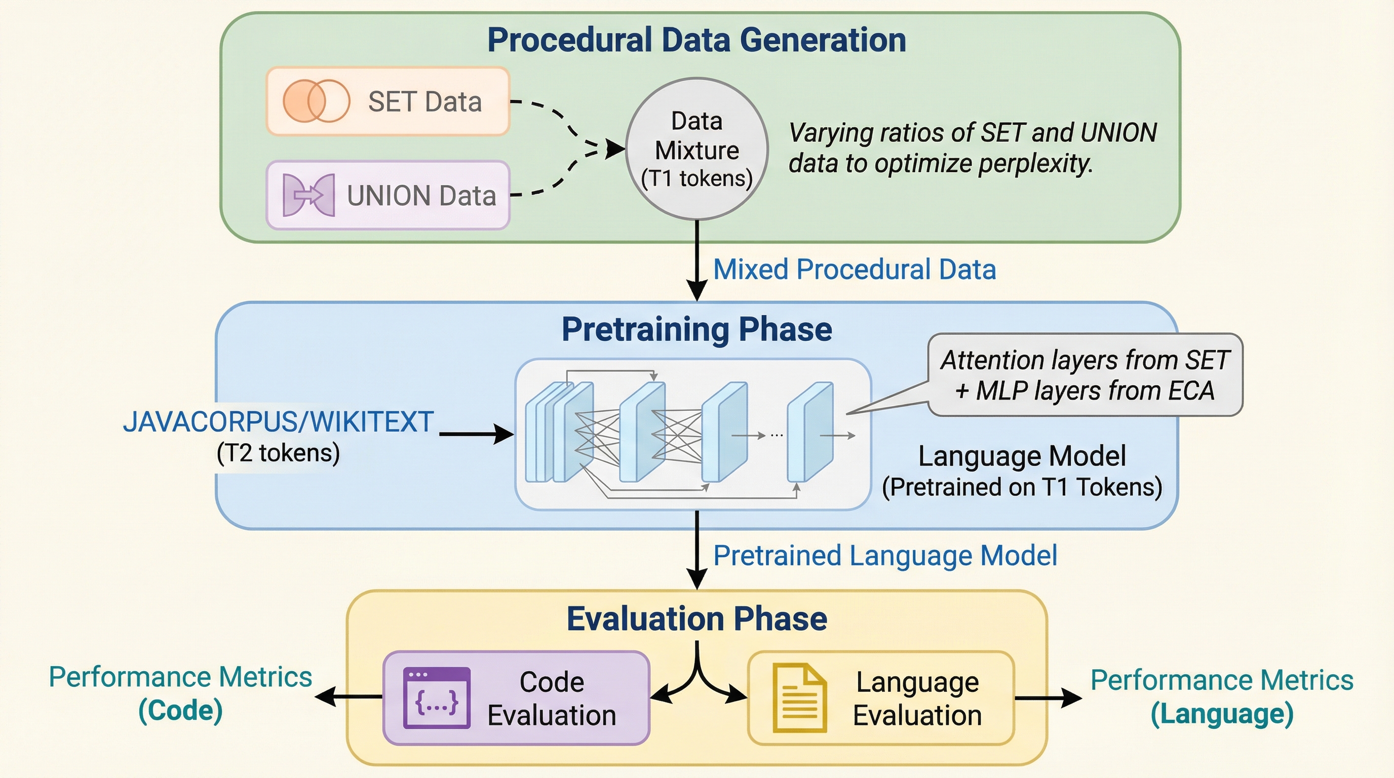 現在の大規模言語モデル(LLM)の構築においては、ウェブから収集された膨大なコーパスを直接学習させることが標準的な手法となっている。しかし、このアプローチには、豊かな意味的知識の吸収と、その知識を操作するための抽象的なスキルの習得が同時に行われるという課題がある。この知識と推論能力の「絡み合い」は、モデルが体系的な推論手順を身につけるのではなく、データの統計的な表面上の特徴やヒューリスティックに依存する原因として指摘されている。モデルが単なるパターンの模倣に終始し、論理的な一貫性を欠く背景には、この学習プロセスの未分化があると考えられる。 人間の場合、高度な推論や専門知識を学ぶ前に、積み木遊びや単純な論理、数学といった基礎的な概念を学ぶ段階がある。これと同様に、言語モデルにも意味的な内容に惑わされる前に、純粋な論理構造やアルゴリズム的な「足場」が必要であると考えられる。既存の研究では、形式言語から生成されたデータが自然言語よりもトークンあたりの学習価値が高いことや、コードの学習が構成的・再帰的な推論を助けることが示唆されてきた。…