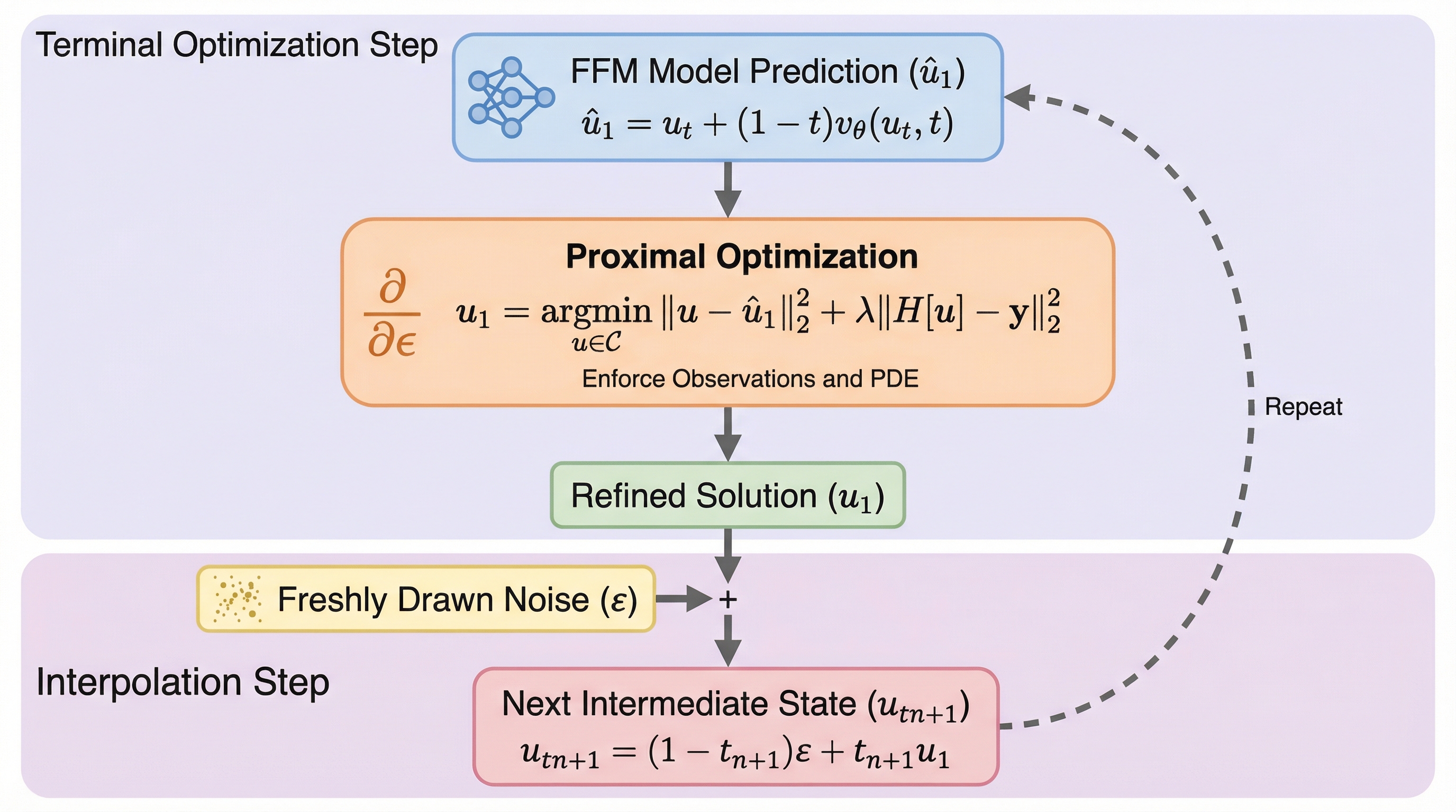 本研究が提案するProFlowは、事前学習済みの生成モデルを固定したまま、サンプリング時に物理制約と観測データを統合する「近接流ガイダンス(Proximal Flow Guidance)」フレームワークである。この手法の核心は、関数空間上の連続的な流れを学習するFunctional Flow Matching(FFM)を生成事前分布として採用し、サンプリングの各ステップで物理法則と観測データの両方に整合するように軌道を修正する点にある。具体的には、モデルが予測した候補状態を物理的に許容可能な集合と観測データに合致する集合の交点へと投影する「終端最適化」と、その修正された状態を学習済みの確率パスへと戻す「補間」の二段階プロセスを繰り返す。これにより、タスク固有の再学習を行うことなく、未知の境界条件や観測データに対しても即座に適応可能なゼロショット性能を実現している。…