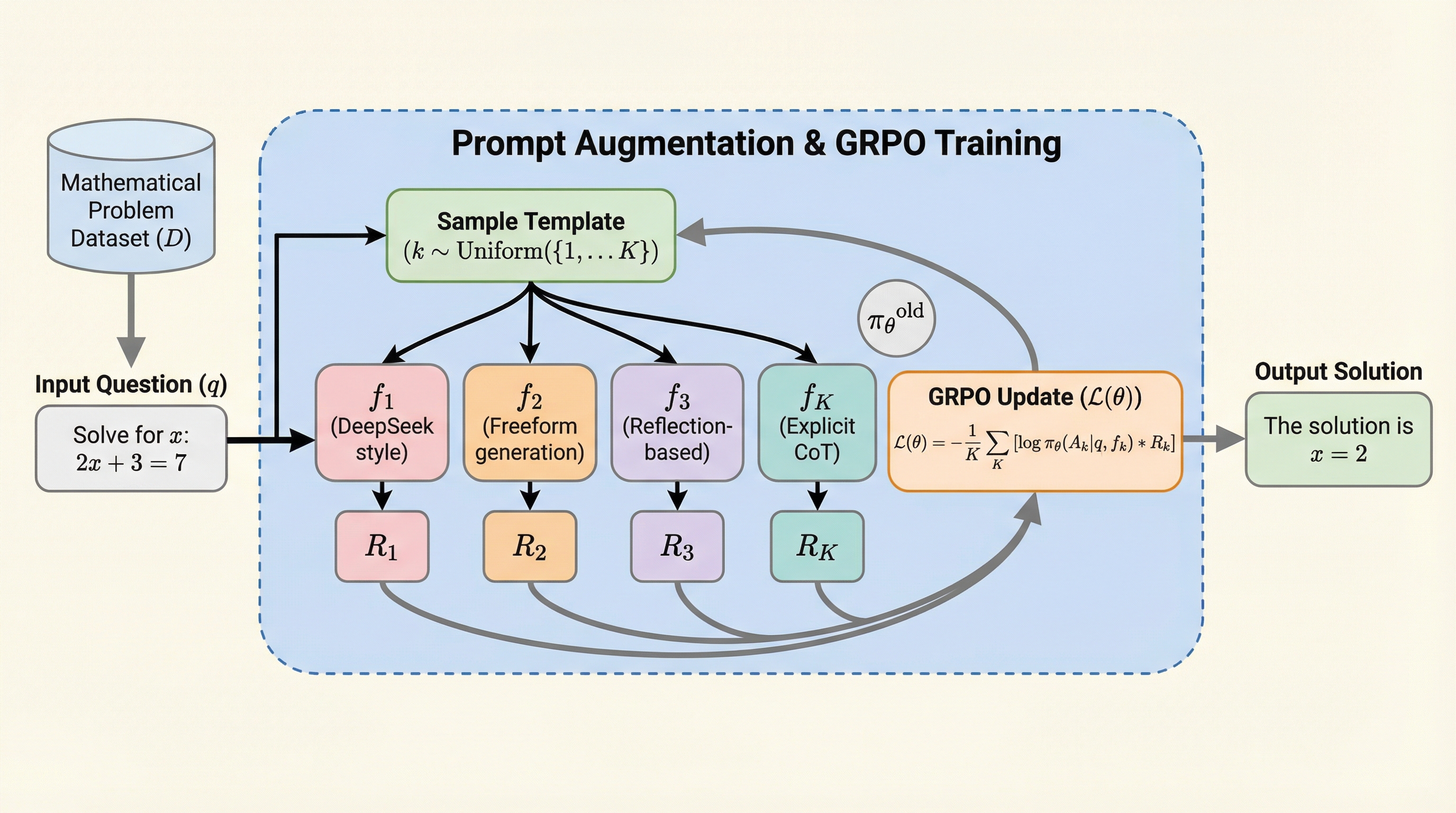 本研究では、LLMの数学的推論のための強化学習におけるシンプルかつ効果的な手法として「プロンプト拡張(Prompt Augmentation)」を提案しました。この手法の核心は、単一の学習実行の中で、モデルに対して多様なテンプレートやフォーマットを用いて推論の軌跡を生成させることにあります。具体的には、タグを用いた推論と回答の分離、自由形式の生成、明示的な思考連鎖(Chain-of-Thought)プロンプト、そして自己反省(Reflection)ベースのフォーマットなど、複数の推論スタイルを混合して学習を行います。…