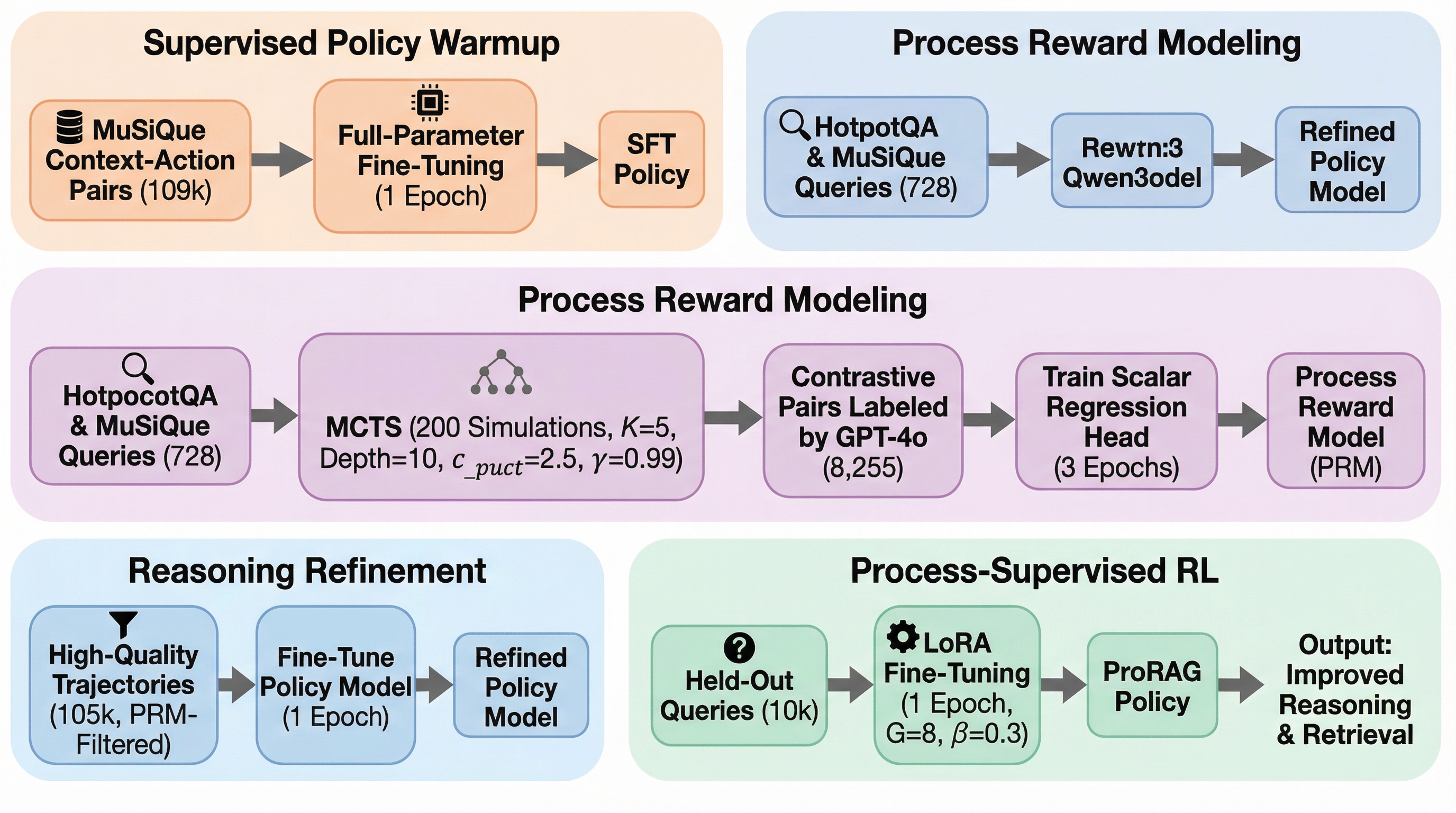 本論文では、マルチホップRAGにおけるクレジット割り当て問題を根本から解決するために、学習されたステップレベルの監視をオンライン最適化ループに直接統合する革新的なフレームワーク「ProRAG」を提案しています。ProRAGの核心は、単なる結果の報酬に依存するのではなく、推論の各段階に対して即時かつ精密なフィードバックを提供する仕組みを構築した点にあります。…