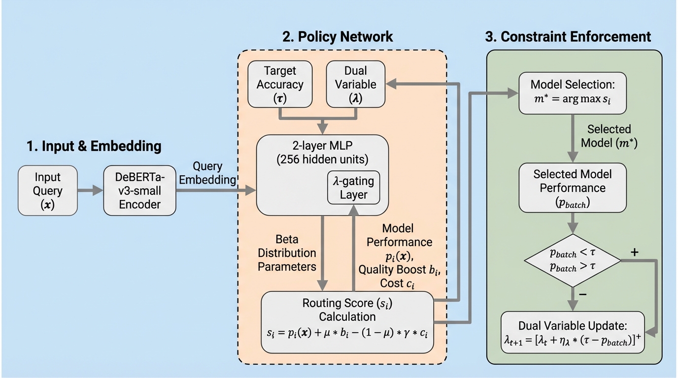 提案の核は、SLA 適応型の振り分けを制約付き最適化として定式化し、精度目標 τ を実行時の条件にしたことです。最適化問題としては、「コストを最小化しつつ、期待精度が τ 以上になるようにする」という形です。重要なのは、τ が学習時の固定条件ではなく、推論時にクエリと一緒に入る入力になっている点です。