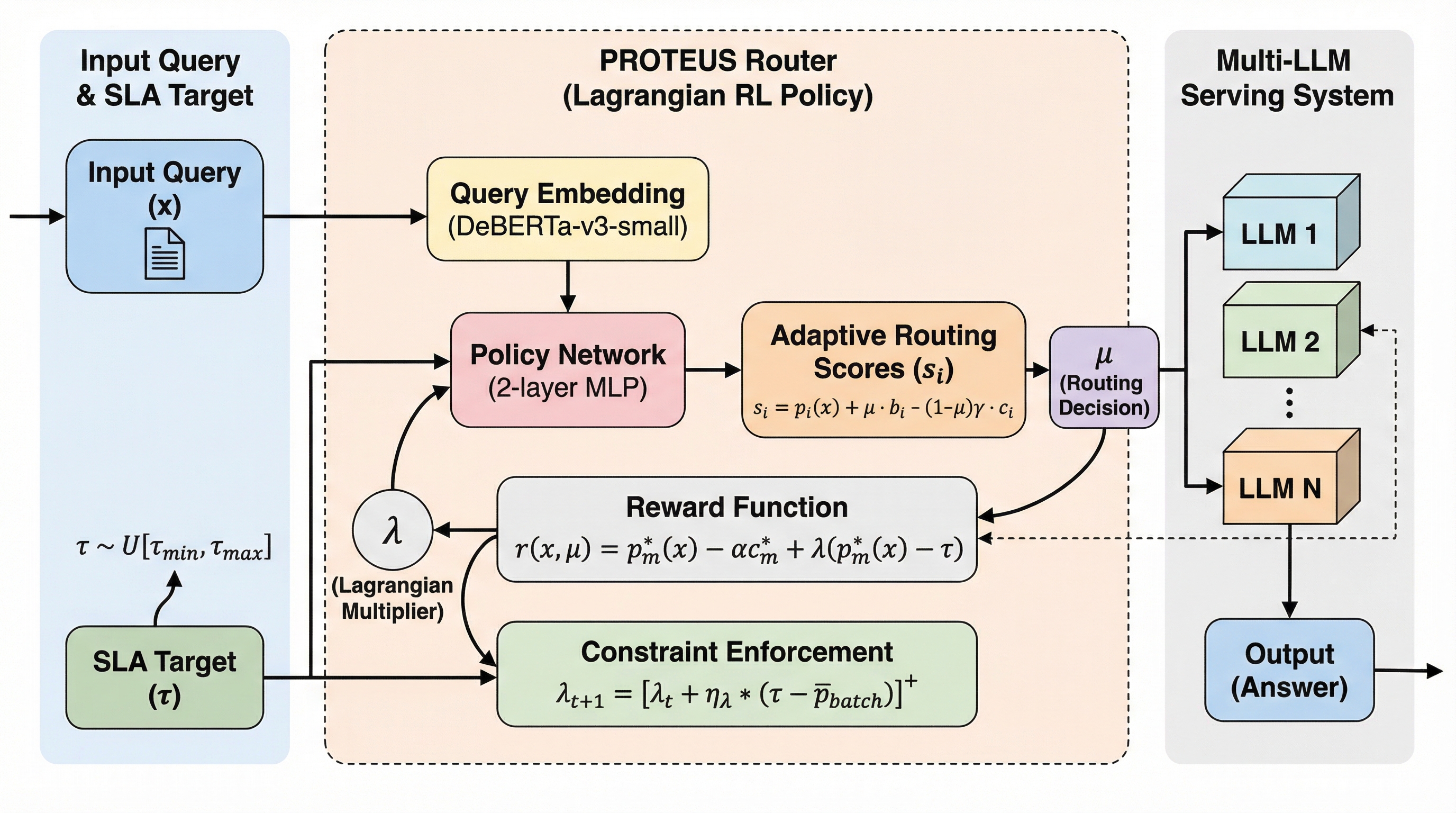本研究では、精度目標($\tau$)を実行時の入力として受け入れる革新的なルーターであるPROTEUS(統合SLAによる運用目標執行のための多態的ルーター)を提案します。PROTEUSの最大の特徴は、ラグランジュ双対制御を採用している点にあります。学習された双対変数($\lambda$)が訓練中の制約違反を動的に追跡し、方策ネットワークを条件付けます。これにより、ルーターは指定された$\tau$の値を、それを満たす最適なルーティング決定へと直接変換することが可能になります。 PROTEUSは「ポリモーフィック(多態的)」な性質を持っており、単一の学習済みモデルで、再学習を行うことなく全範囲の精度要求に対応します。…