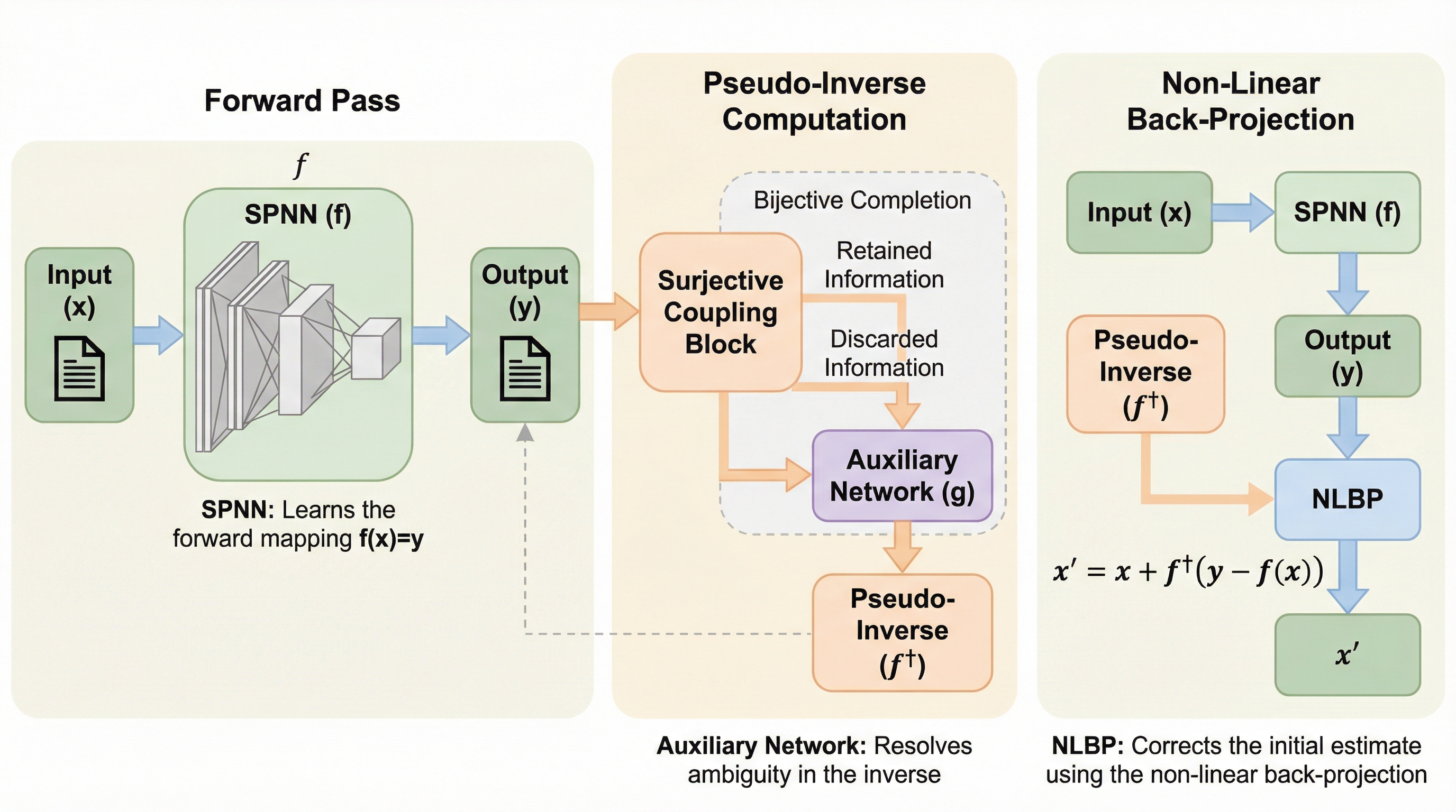 線形システムにおけるMoore-Penroseの擬似逆行列(PInv)を非線形領域および深層学習へと拡張し、情報の損失を伴う全射的な写像においても厳密な代数的整合性を保持する新アーキテクチャ「SPNN」を提案した。