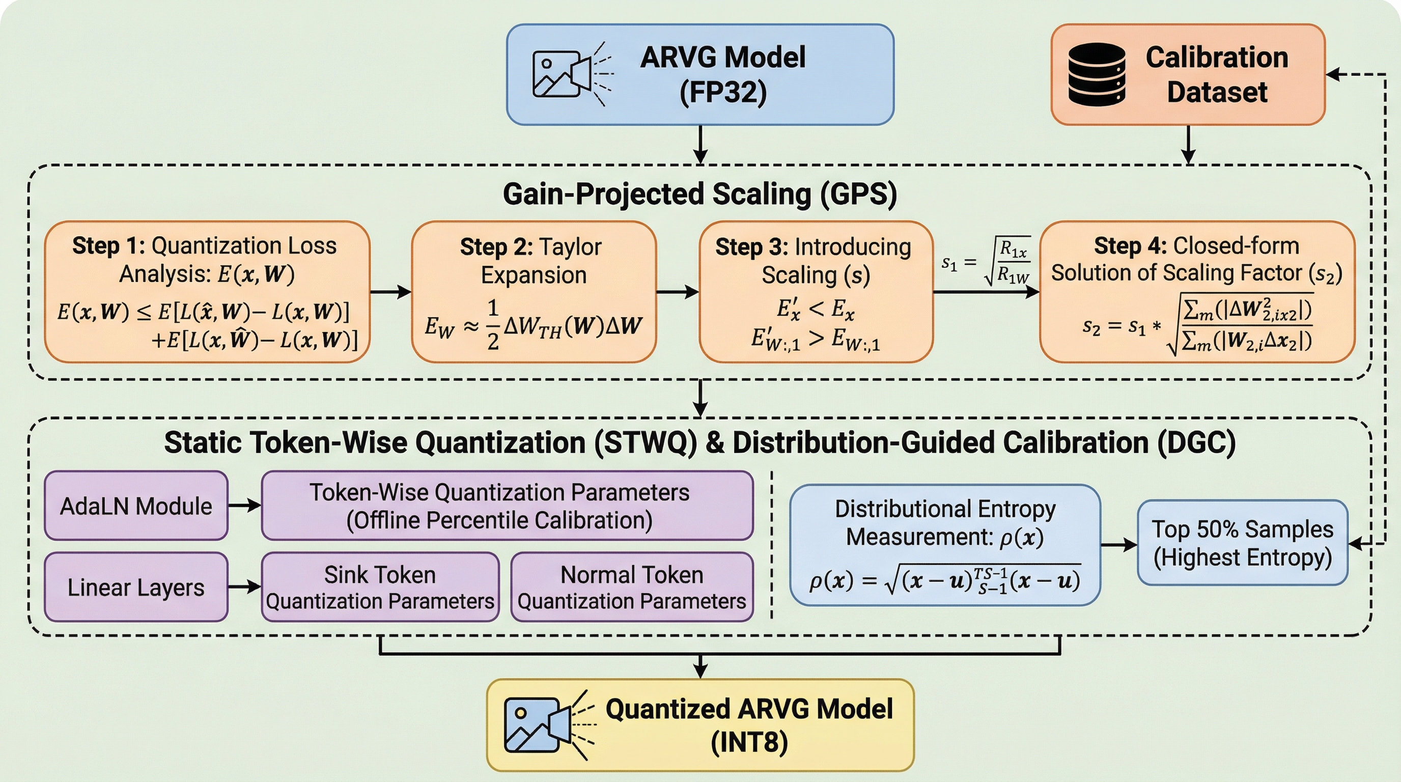 本論文では、ARVGモデル群のために特別に設計された、追加学習を必要としない初の包括的なPTQフレームワーク「PTQ4ARVG」を提案している。このフレームワークは、前述の3つの課題を解決するために、数学的理論に基づいた3つの主要コンポーネントで構成されている。 一つ目は「利得投影スケーリング(Gain-Projected Scaling: GPS)」である。これは、量子化におけるスケーリングの効果を数学的に分析し、解析的な微分を通じて最適なスケーリング係数を導出する手法である。…