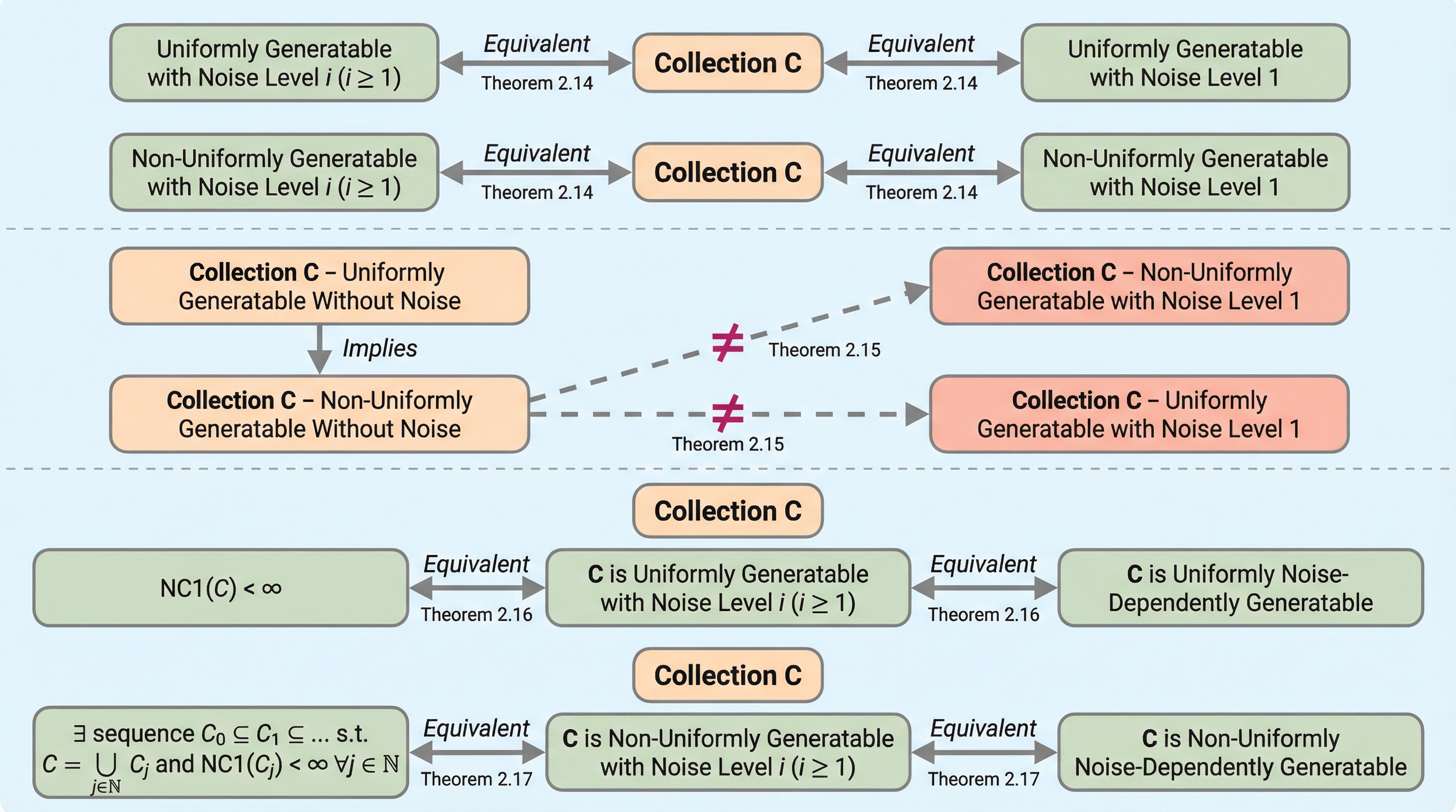 本研究は、言語モデルの生成能力が訓練データに含まれる有限個のノイズから受ける影響を理論的に解明し、クリーンなデータとわずか1つのノイズの間には生成可能な言語集合の厳密な減少を伴う決定的な断絶があることを数学的に証明した。 一方で、一様および非一様生成の枠組みにおいては、1つのノイズに対処可能なアルゴリズムは任意の有限個のノイズにも対処できるという「ノイズの等価性」を見出し、ノイズの数が増えるごとに能力が制限されるという従来の階層的な予測を覆した。 これらの成果に基づき、ノイズが存在する現実的な環境下で言語生成が可能となるための数学的な構造的特徴付けを世界で初めて提示し、ノイズレベル1の「閉包次元」が有限であることが生成可能性の鍵であることを明らかにした。