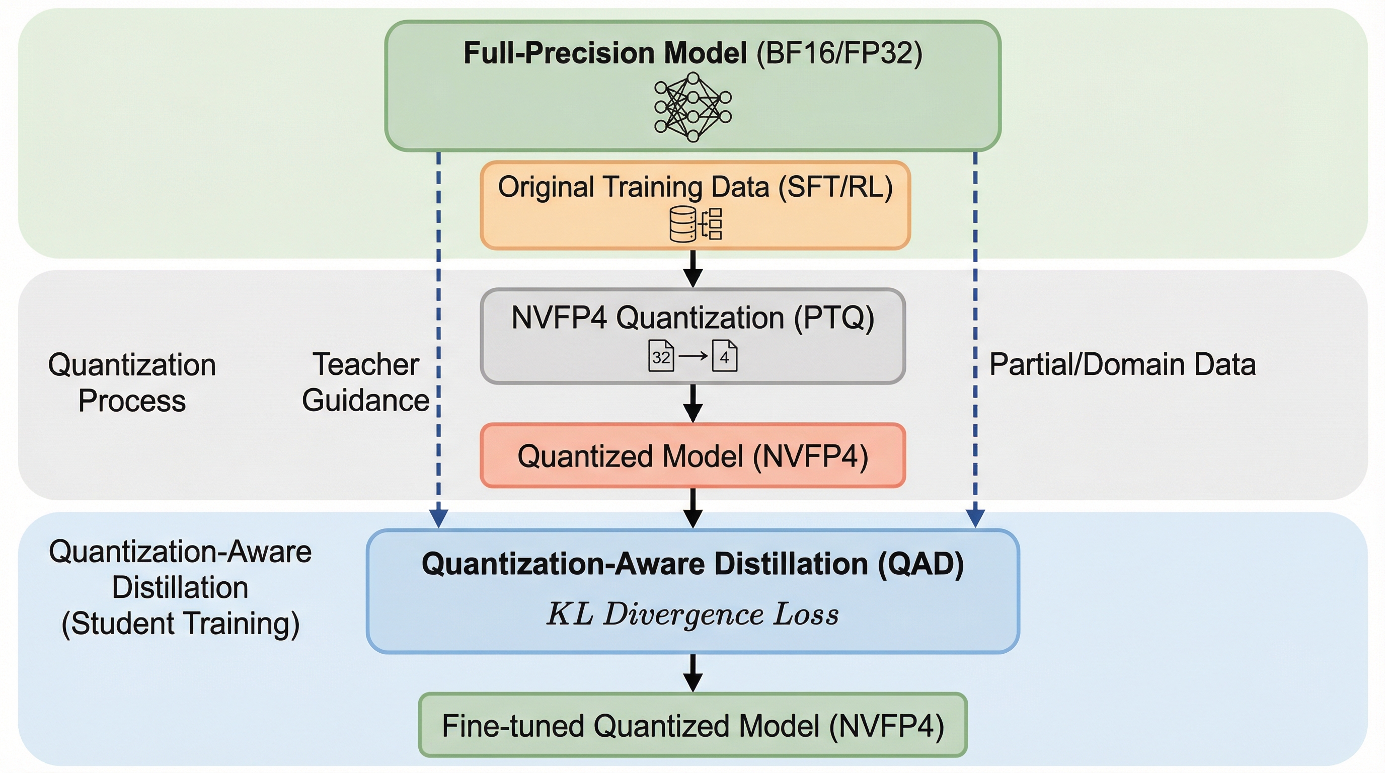 本報告では、NVFP4量子化されたLLMおよび視覚言語モデル(VLM)の推論精度を回復させるための手法として、量子化認識蒸留(QAD)を提案している。 QADは、元のフル精度(BF16など)のモデルを「教師」とし、量子化されたモデルを「学生」として、教師モデルの出力分布を学生モデルに模倣させる手法である。 この手法の最大の特徴は、タスク固有の損失関数(例えば言語モデリングにおける次トークン予測のクロスエントロピー損失)を使用するのではなく、教師と学生の間のKLダイバージェンス損失を最小化することに焦点を当てている点にある。 QADは、従来のQATと比較して、量子化モデルを元の高精度モデルの出力分布により忠実に整列させることができる。 特に、SFTやRL、モデルマージを経て構築されたモデルにおいて、QADは訓練の安定性を保ちながら、BF16に近い精度まで回復させることが可能である。…