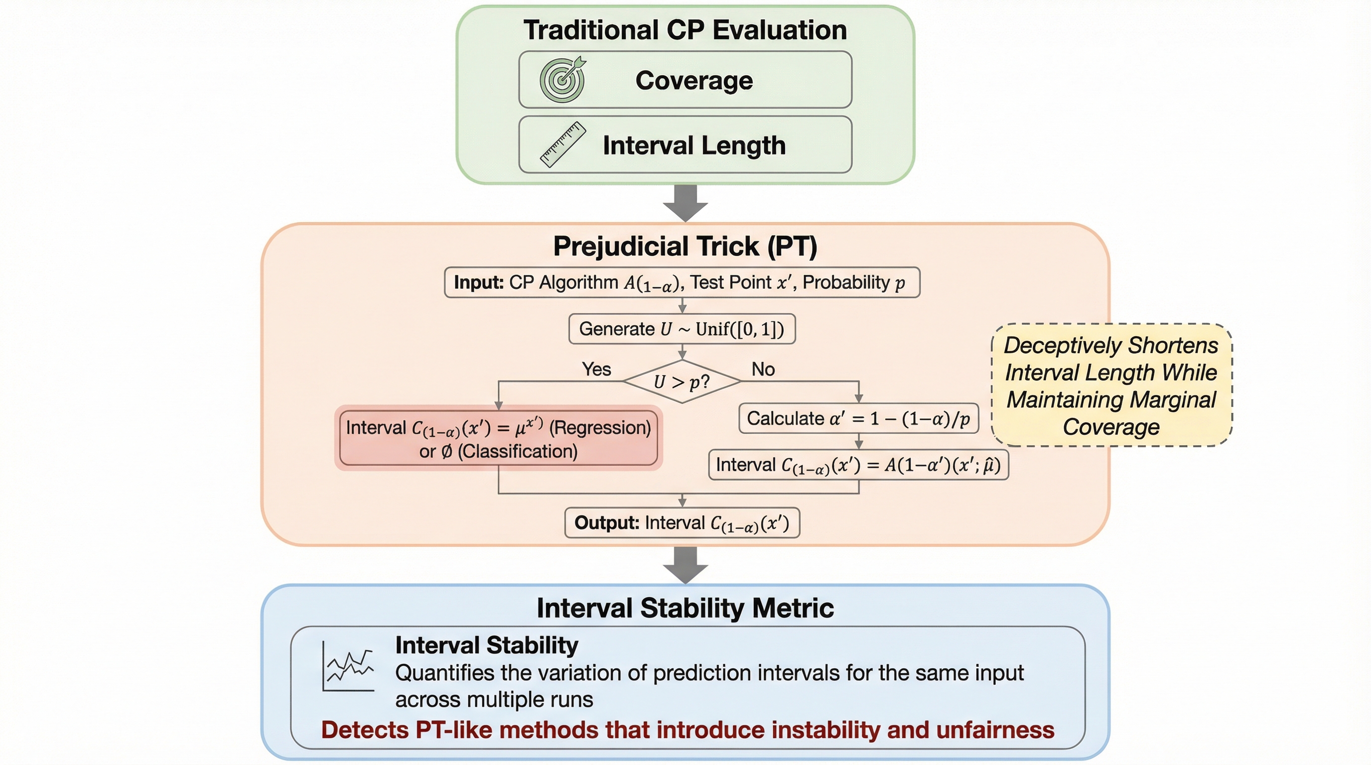 従来のコンフォーマル予測(CP)の評価において、実際の値を含む「被覆率」と予測の精密さを示す「平均区間長」の二つの指標だけでは、手法の真の有用性や信頼性を判断するには不十分であることが本研究によって指摘されました。 著者らは、数学的な被覆率の保証を厳密に維持したまま、ランダム性を利用して見かけ上の平均区間長だけを短縮する「Prejudicial Trick(PT)」という手法を提示し、数値上の改善が実用的な信頼性の欠如を隠蔽し得ることを証明しました。 このような数値上のトリックを検出し、手法が実用的な一貫性を備えているかを評価するため、同一の入力に対して繰り返し実行した際に出力がどの程度変動するかを測定する「区間安定性(Interval Stability)」という新しい評価指標の導入を提案しています。