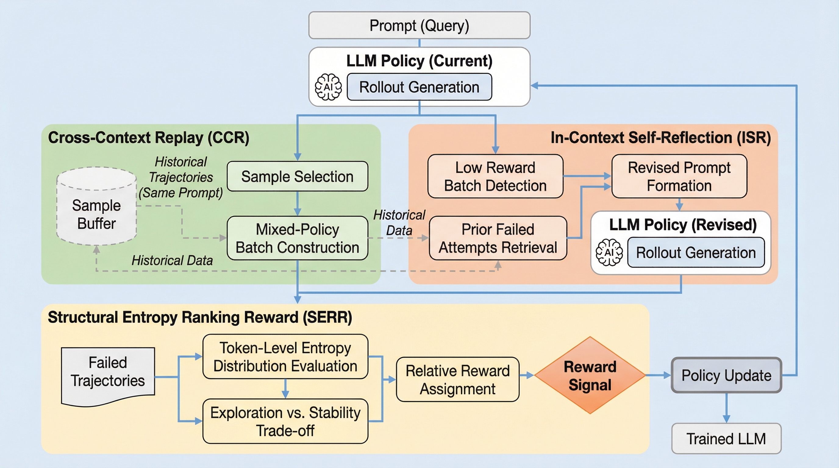 本研究では、上述のアドバンテージ崩壊という根本的な課題を解決するために、「R^3(Replay, Reflection, and Ranking Rewards)」と名付けられた新しい強化学習メカニズムを提案しています。このフレームワークの最大の特徴は、外部的な介入と内部的な自己最適化を巧みに組み合わせることで、どのような困難な状況下でもグループ内のアドバンテージを明示的に維持し、学習を継続させる点にあります。R^3は、主に3つの革新的なアプローチで構成されています。…