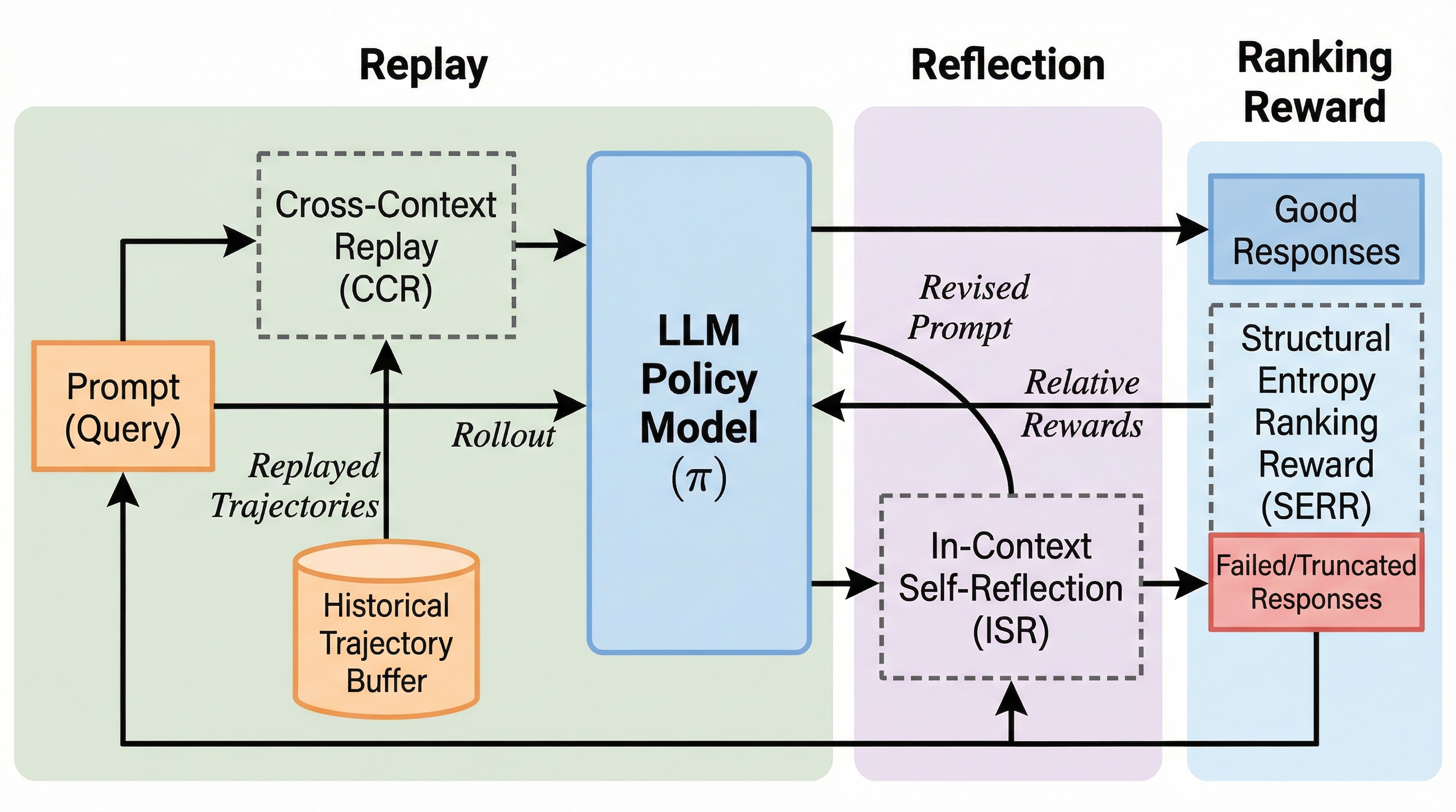 本研究では、上述の課題を根本から解決するために「R³(Replay, Reflection, and Ranking Rewards)」と呼ばれる新しい強化学習フレームワークを提案しました。このフレームワークは、外部からの介入と内部的な自己最適化を組み合わせることで、アドバンテージの崩壊を防ぎ、学習効率を劇的に向上させることを目的としています。R³は、以下の3つの主要なコンポーネントで構成されています。 第一の柱は、クロスコンテキスト・リプレイ(CCR)です。これは学習中に生成された過去の回答とその報酬を保存しておく「サンプルバッファ」を活用する戦略です。…