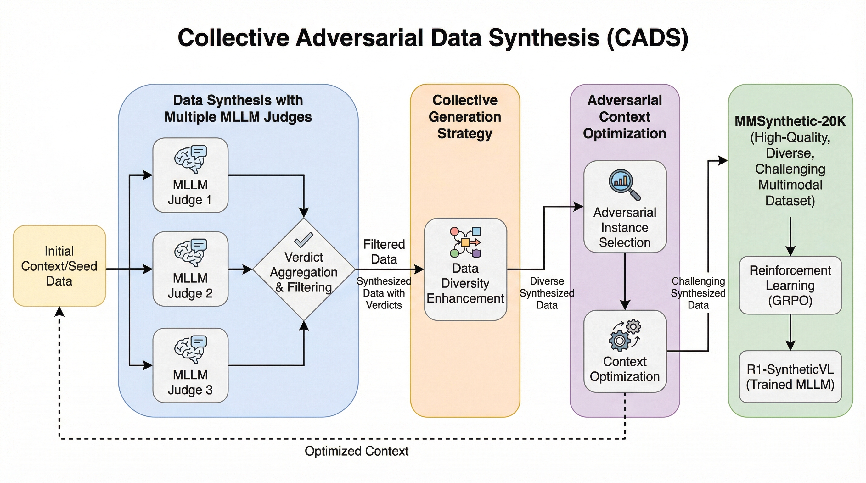 マルチモーダル大規模言語モデル(MLLM)の進化において、高品質な学習データの不足とアノテーションコストの増大が深刻な課題となっており、特に複雑な推論を必要とする実世界のタスクに対応するための思考の連鎖(CoT)を含むデータの入手は極めて困難です。 本研究では、複数のモデルの知能を統合する集合知と敵対的学習を組み合わせ、高品質で多様かつ挑戦的なデータを自律的に合成する新手法「Collective Adversarial Data Synthesis(CADS)」を提案し、データの質、多様性、難易度の問題を同時に解決しました。 この手法で構築した2万件のデータセット「MMSynthetic-20K」を用いて強化学習を行ったモデル「R1-SyntheticVL」は、MathVistaなどの主要なベンチマークで既存手法を上回る優れた性能を示し、合成データがMLLMの能力向上に有効であることを証明しました。