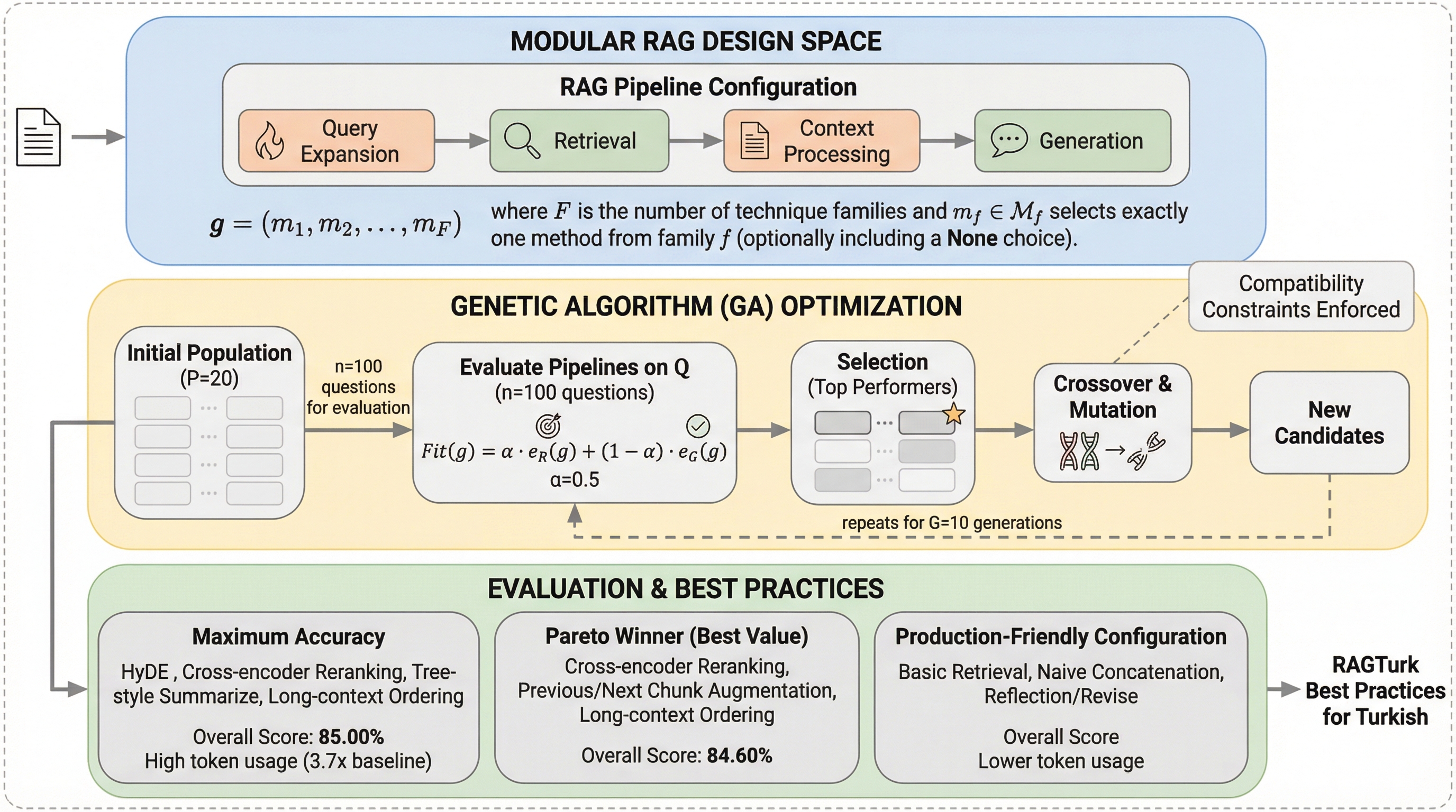 トルコ語のような形態論的に豊かな言語における検索拡張生成(RAG)の挙動を解明するため、WikipediaとCulturaXから構築された20,459個の質問回答ペアを含む初の包括的データセット「RAGTurk」が提案されました。 研究ではクエリ変換から回答の洗練に至る7つの主要ステージをベンチマークし、HyDEが最高精度(85%)を達成する一方で、クロスエンコーダによる再ランキングとコンテキスト拡張を組み合わせた構成が低コストで同等の性能(84.60%)を実現することを明らかにしました。 生成モジュールを過剰に積み重ねるとトルコ語特有の形態論的な手がかりが歪められ、かえって性能が低下するリスクがあるため、堅牢な再ランキングとシンプルなクエリの明確化を核としたパイプライン設計がトルコ語RAGにおいて最も効果的であると結論付けられています。