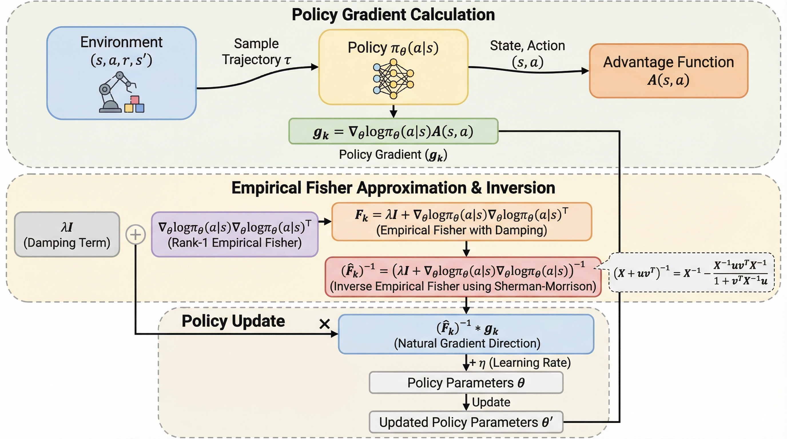 深層強化学習における自然方策勾配法(NPG)は、学習の収束が早く幾何学的に適切な更新が可能である一方、フィッシャー情報行列(FIM)の逆行列計算にパラメータ数の3乗という膨大な計算コストがかかる点が実用上の大きな障壁となっていました。