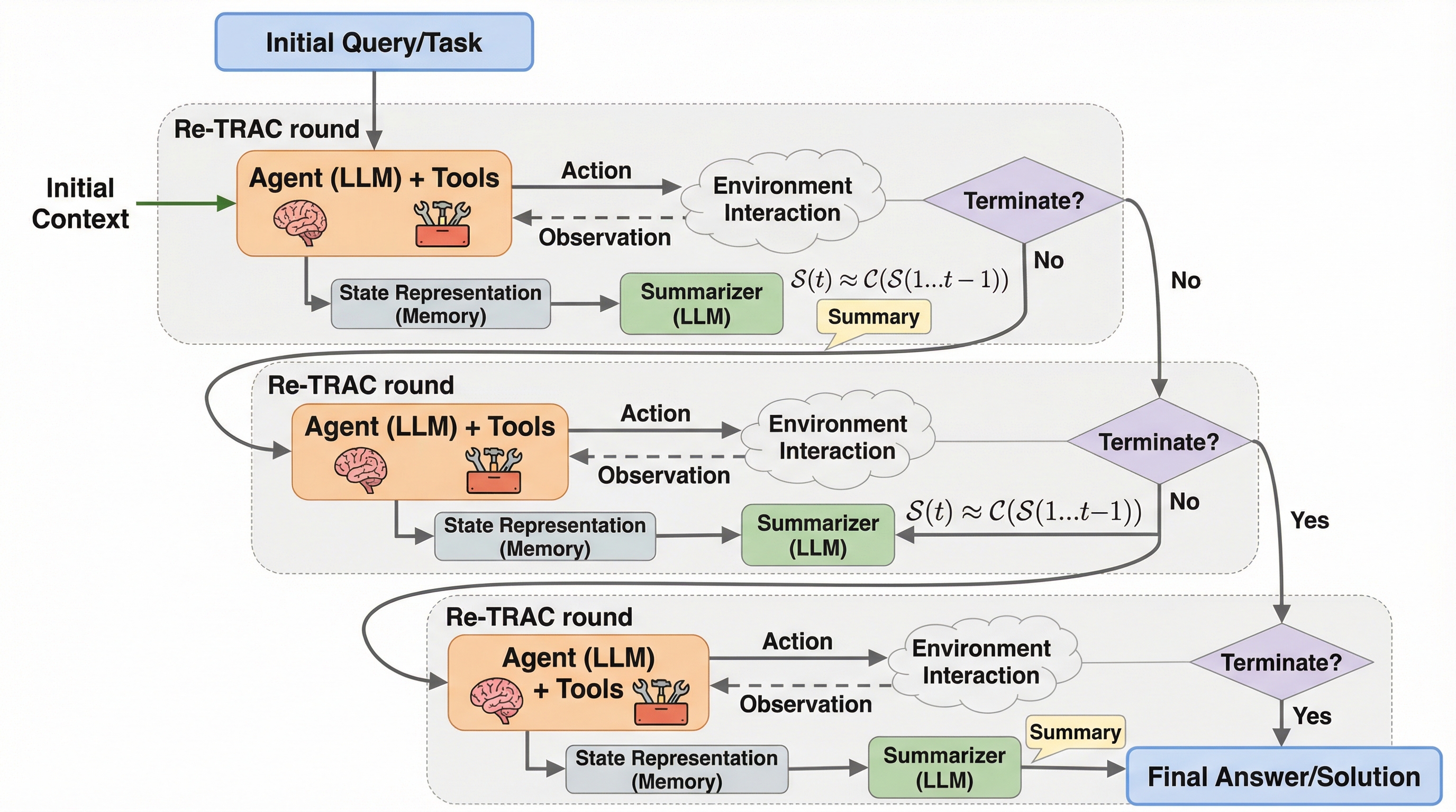 提案はRe-TRAC(REcursive TRAjectory Compression for Deep Search Agents)。 要点はシンプルで、「探索を1本の物語で終わらせず、複数の探索をまたいで経験を圧縮し、次の探索に引き継ぐ」枠組みです。 ここで重要なのは、複数回試すこと自体ではなく、“複数回のあいだに何が蓄積されるのか”を明示的に設計対象にする点で、探索を手続きとして進化させようとしています。