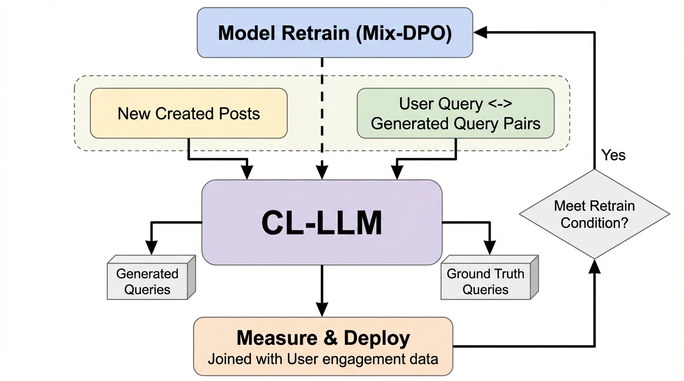 検索トラフィックが少ない環境では、従来のクエリ量に基づくトレンド検出が困難であるため、投稿内容から直接検索クエリを生成して合成シグナルを作るRTTPフレームワークが提案されました。 このシステムは、継続学習型の大規模言語モデル(CL-LLM)と、新旧のデータを適切に混合して学習させるMix-Policy DPOという新しい最適化手法を採用しており、モデルの知的な推論能力を維持しながら最新の話題に適応し続けることが可能です。 FacebookやMeta AIの製品規模で導入された結果、トレンド検出の精度が相対的に91.4%向上し、クエリ生成の正確性も従来手法より19%改善しており、ユーザーが検索を開始する前の極めて早い段階でトレンドを予測できることが実証されました。