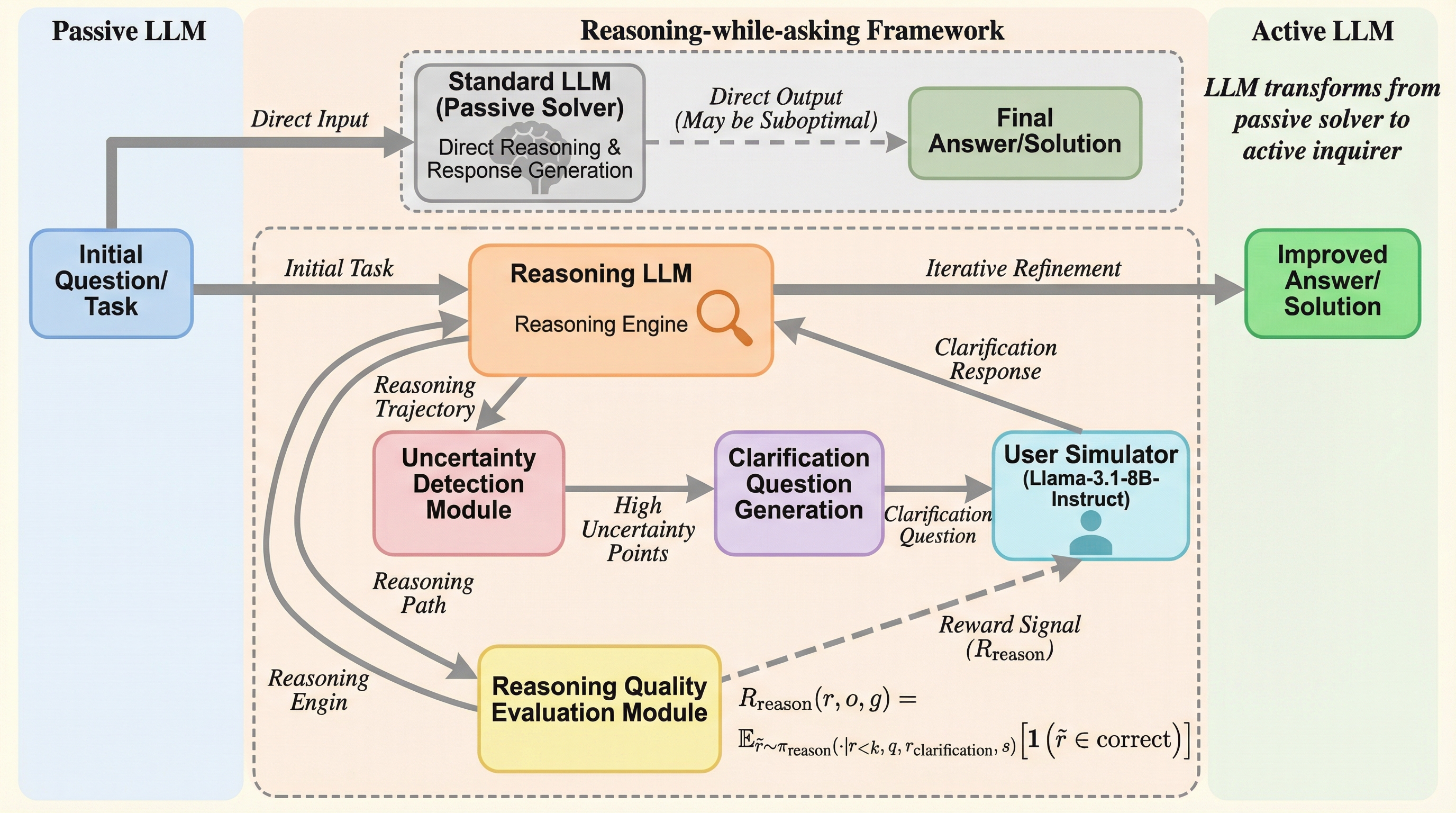 OpenAIのo1やDeepSeek-R1に代表される推論型モデルが、情報不足の状況でも強引に推論を進めてしまう「盲目的な自己思考」という課題に対し、本研究は能動的に質問を行うPIRフレームワークを提案しました。