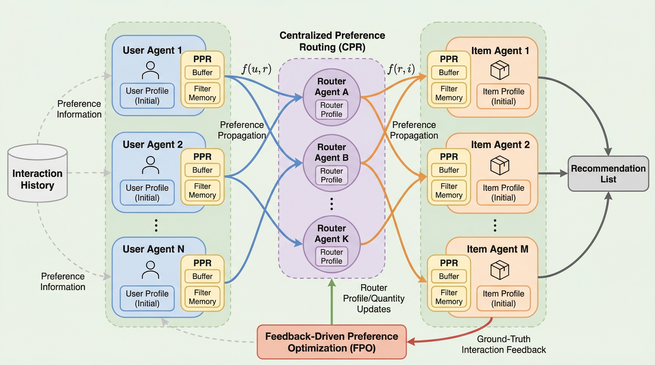 従来の推薦システムは、クリックや購入といった明示的な相互作用が発生した瞬間にのみ受動的にプロファイルを更新していたが、本研究ではユーザーやアイテム間でリアルタイムに嗜好情報を能動的に伝播させる「RecNet」を提案し、直接的な接触がない場合でも相互影響を捉える手法を確立した。 コンピュータネットワークのルーティング機構に着想を得た「クライアント・ルーター・クライアント」構造を採用し、ルーターエージェントがコミュニティレベルで情報を集約・配信する仕組みと、個別のエージェントがバッファやフィルタメモリを用いて情報を選別する仕組みにより、大規模システムにおける効率性と高度なパーソナライズを両立させている。 推薦結果に対するフィードバックに基づき、大規模言語モデルを活用したテキストベースのバックプロパゲーションを通じて、ルーターの配信戦略や受信側のフィルタリングルールを自律的に最適化する機能を備えており、動的な環境下でシステム全体が自己進化を続け、時間の経過とともに精度を向上させることが可能である。