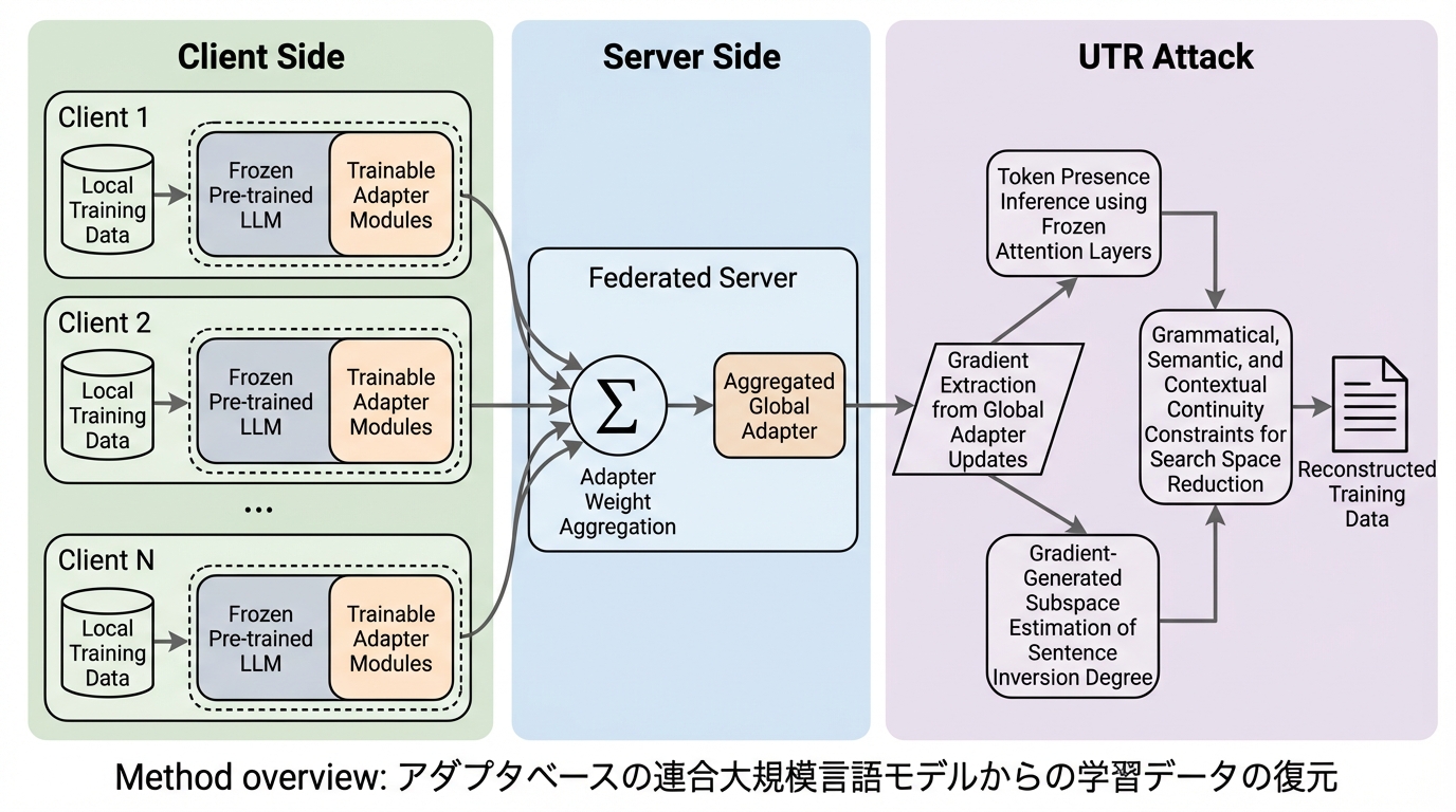 アダプタベースの連合大規模言語モデル(FedLLM)は、計算資源の節約とプライバシー保護を両立する手法として広く採用されていますが、本研究は「UTR」という新しい攻撃手法を用いることで、凍結されたモデル背後にある秘密の学習データを極めて高い精度で復元できることを明らかにしました。 UTR攻撃は、埋め込み層のアダプタ勾配から出現トークンを特定する「ワードバッグ推論」と、レイヤーアダプタの勾配を利用して文法・意味的整合性を保ちながら文章を組み立てる「データ推論」の2段階で構成されており、従来の手法では困難だった大規模なバッチサイズでの復元を可能にしています。 実験では、GPT-2やQwen2.5-7Bといった主要なモデルにおいて、バッチサイズ128という過酷な条件下でもROUGE-1/2スコアが99を超えるほぼ完璧な復元に成功しており、軽量なアダプタ学習が必ずしもデータの安全性を保証しないという、効率性とプライバシーの間の根本的な矛盾を提示しました。