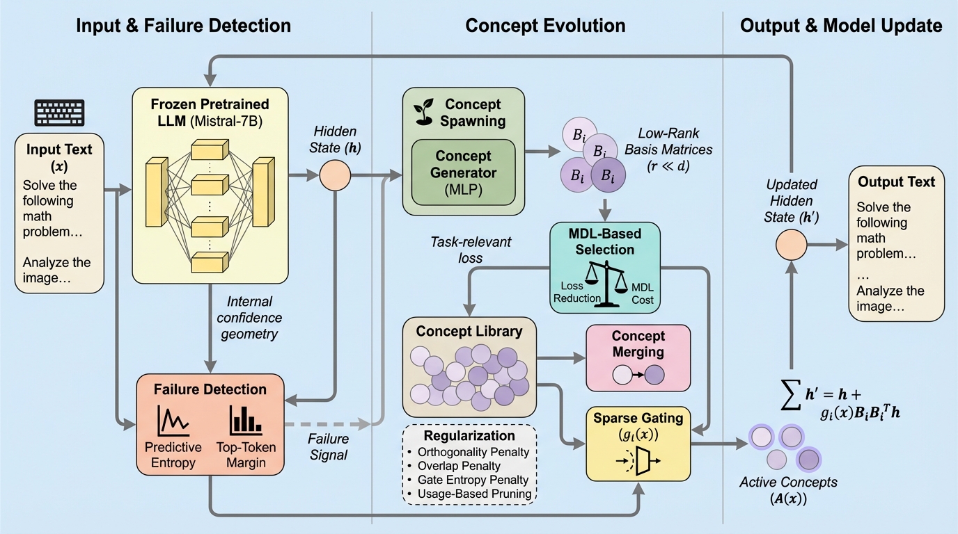 提案はRecursive Concept Evolution(RCE)であり、凍結した事前学習済み言語モデルが、推論時に自分の内部表現の幾何を作り替えられるようにする枠組みです。重要なのは、ベースモデルの重みそのものを更新するのではなく、あるデコーダ層の残差ストリームに「概念部分空間」を注入して、以降の層が受け取る中間表現を変形させる点です。RCEは概念ライブラリを維持し、各概念は低ランクの基底行列 (Bi \in \mathbb{R}^{d \times r})((r \ll d))と、入力ごとに活性度を決めるゲート関数 (gi(x)\in[0,1]) を持つとされています。…