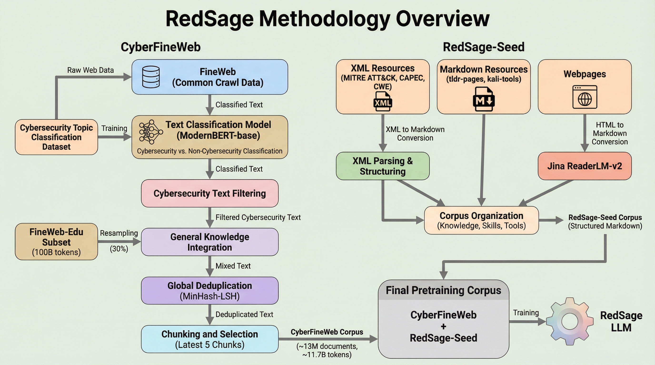RedSageは、11.8Bトークンの専門データを用いた継続事前学習と、エージェントによる266K件の高品質な対話データ拡充を組み合わせ、サイバーセキュリティ領域に特化したオープンソースの8Bパラメータモデルである。