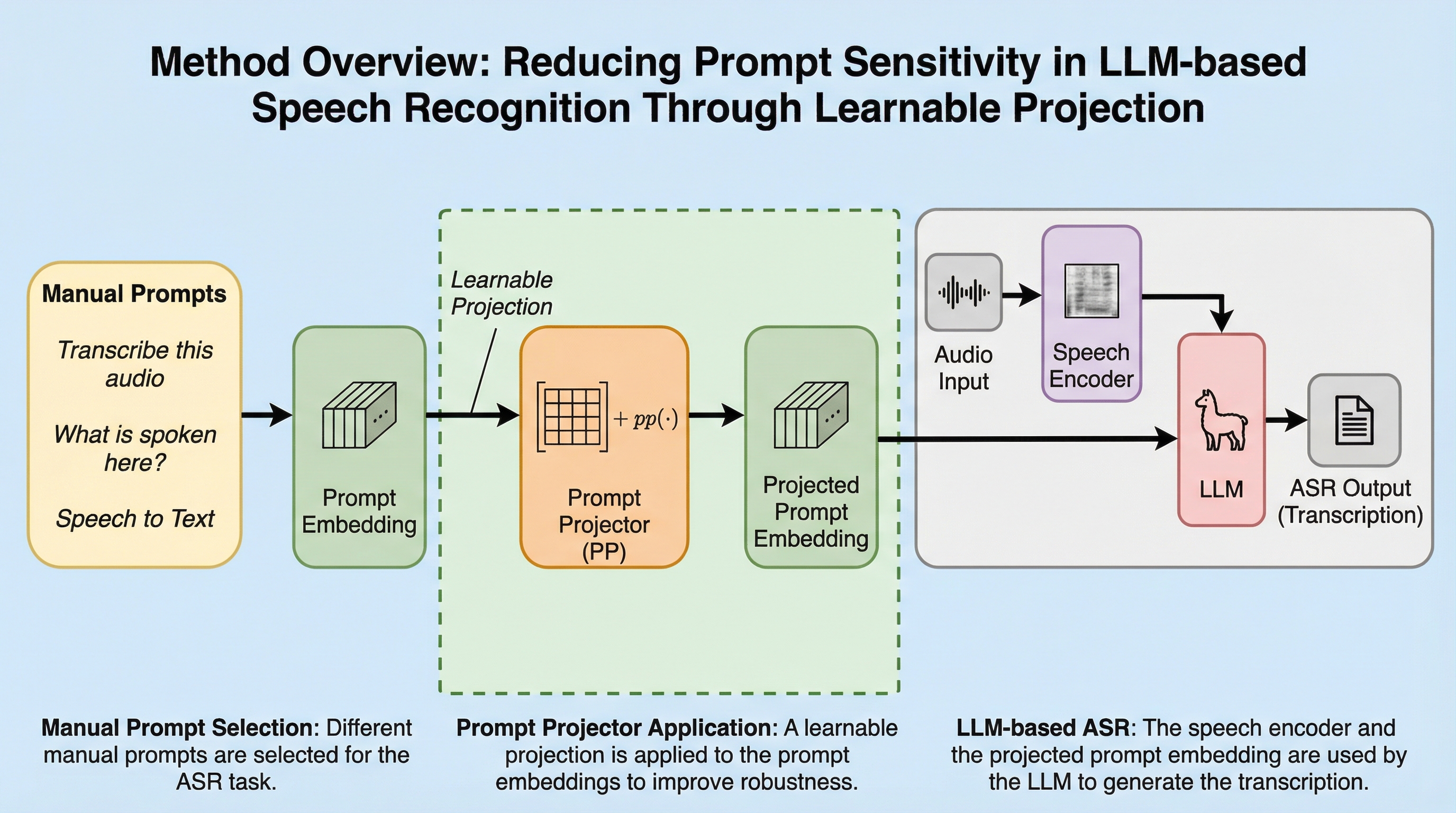大規模言語モデル(LLM)を用いた音声認識(ASR)において、人間が手動で設計する固定プロンプトの文言や配置が、単語誤り率(WER)などの性能に極めて大きな影響を与え、データセットごとに最適解が異なるという深刻な不安定性を引き起こしていることが本研究の体系的な調査によって明らかになりました。 この課題を解決するために、音声信号をLLMの入力空間にマッピングする手法から着想を得て、プロンプトの埋め込みをLLMがより効果的に処理できる領域へと変換する軽量な学習可能モジュール「プロンプト・プロジェクター」を提案し、既存のモデル構成を一切変更することなく、プロンプトの選択に対する感度を大幅に低減することに成功しました。 4つの多様なデータセットを用いた広範な検証の結果、提案手法はプロンプトの差異による性能のばらつきを劇的に抑えるだけでなく、人間が試行錯誤して選んだ最良のプロンプトを使用した場合の精度を一貫して上回り、さらにLoRAなどの追加の微調整手法とも高い相乗効果を発揮してシステムの堅牢性を飛躍的に向上させることが証明されました。
