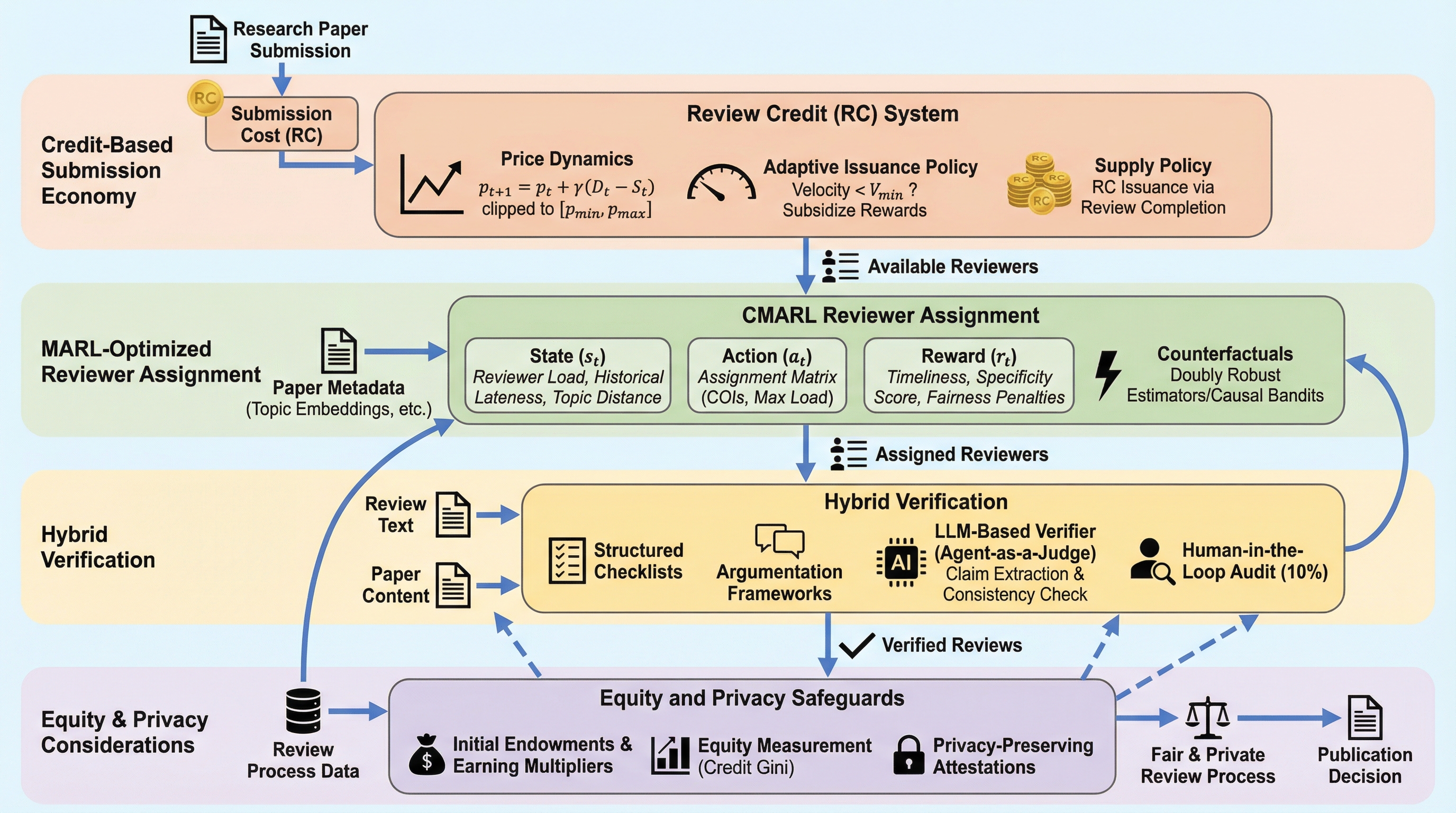 現在の学術論文査読システムは、投稿数の急増と査読者のインセンティブ不一致により「共有地の悲劇」に直面しており、査読結果の不一致や大規模言語モデル(LLM)による質の低下が深刻な問題となっています。 本論文は、この危機を社会問題ではなく「メカニズム設計」の失敗と捉え、研究コミュニティを確率的マルチエージェントシステムとしてモデル化し、強化学習を用いて個人の合理性と集団の利益を一致させる新しい枠組みを提案します。 具体的には、査読への貢献を数値化する「査読クレジット」経済圏、強化学習による動的な査読者割り当て、そしてLLMと人間が協力して査読の整合性を検証するハイブリッド体制という3つの柱により、持続可能な査読エコシステムの構築を目指します。