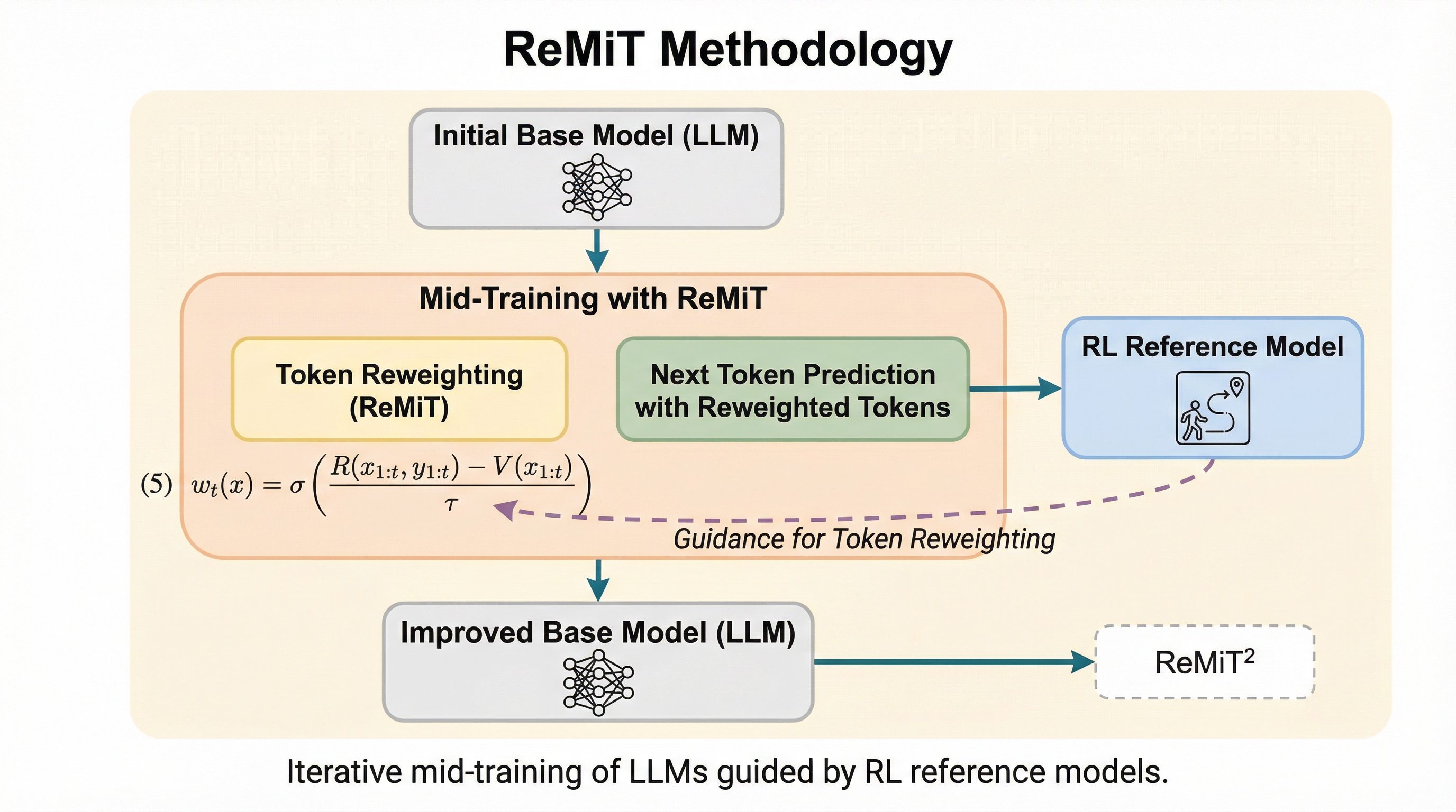 大規模言語モデル(LLM)の学習は、事前学習から事後学習へと進む一方通行のプロセスが一般的でしたが、本研究は事後学習で得られた推論の知見を事前学習の最終段階(ミッドトレーニング)へ遡及的にフィードバックする「ReMiT」を提案しました。