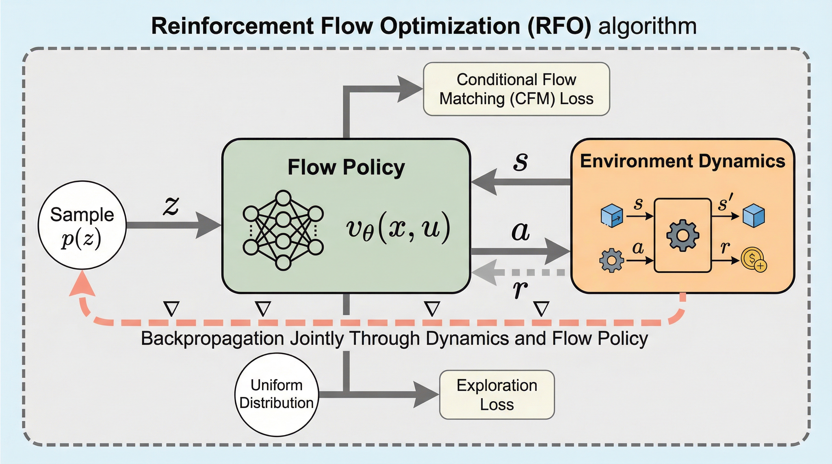 従来の再パラメータ化方策勾配(RPG)はガウス分布に基づく方策に限定されており、多峰性を持つ複雑な行動分布を表現する能力に欠けていたが、本研究では微分可能な常微分方程式(ODE)の積分を通じて行動を生成するフロー方策がRPGの枠組みと自然に適合することを明らかにした。 提案手法であるReparameterization Flow Policy Optimization(RFO)は、フロー生成プロセスとシステムダイナミクスの両方を通じて勾配を共同で逆伝播させることで、計算困難な対数尤度の計算を必要とせずに高いサンプル効率を実現し、さらに安定性と探索のための専用の正則化項を導入している。 多様な移動および操作タスクを用いた実験において、RFOは既存の最先端手法を一貫して上回る性能を示し、特に高次元の行動空間を持つ柔軟体四足歩行タスクでは、既存手法の約2倍の報酬を達成するとともに、視覚入力や複雑な物理シミュレーション環境下での有効性が確認された。