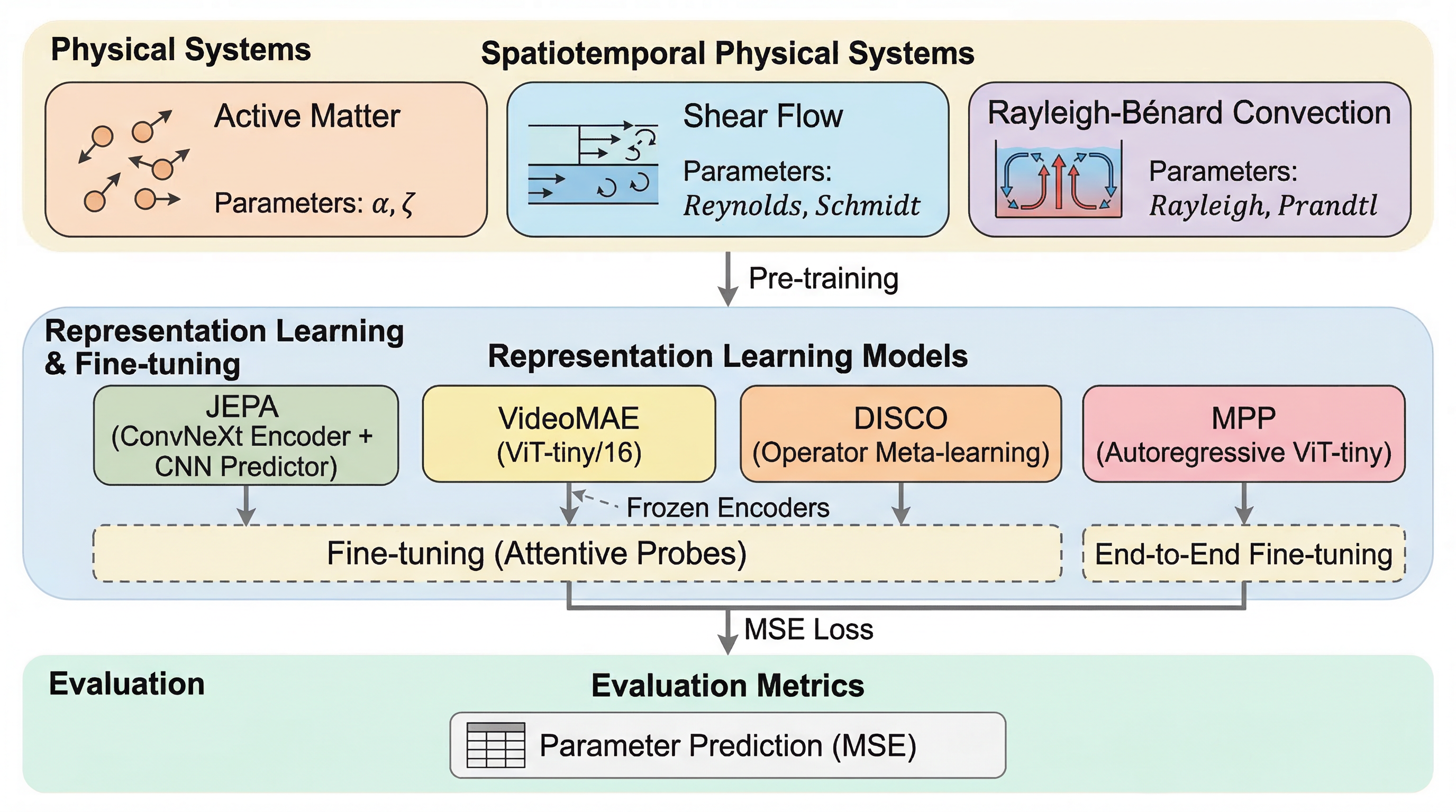 中心にあるのは、新しい巨大モデルの提案というより、物理系の表現学習をどう評価し、どの学習パラダイムが物理的に意味のある表現を作りやすいかを比較する実験枠組みです。比較対象は大きく四つあります。潜在表現空間で未来を当てる JEPA、画素再構成を目的にする masked autoencoding、物理モデリング系ベースラインとしての DISCO、そして自己回帰型 foundation model 的立場の MPP です。