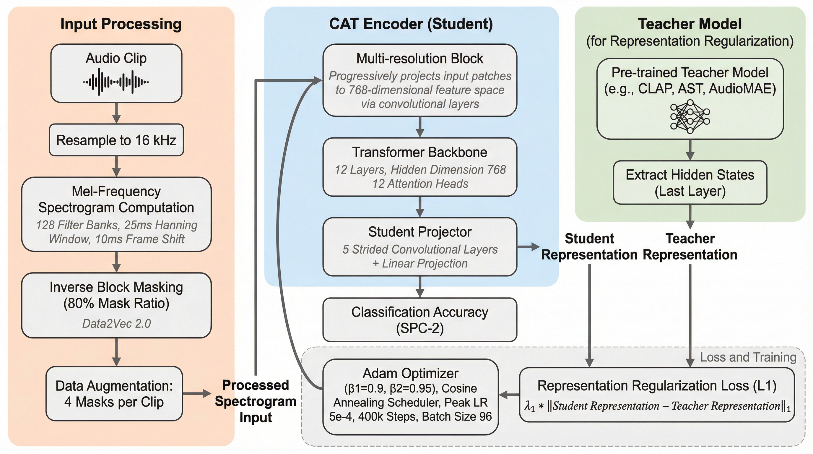 音声信号の理解における「単一の粒度によるモデル化の限界」と「ゼロからの学習に伴う膨大な計算コスト」という二つの主要な課題を解決するため、多解像度ブロックと表現正則化を導入した新しい自己教師あり学習フレームワーク「CAT」を提案した。 多解像度ブロックによって音声の階層的な時間・周波数構造を効果的に捉え、さらに外部の事前学習済みエンコーダ(CLAP等)の知見を学習のガイドとして活用する表現正則化を導入することで、表現の質を向上させつつ学習の収束速度を劇的に高めることに成功した。 実験の結果、AudioSetを含む主要なベンチマークで従来の最高性能(SOTA)を更新し、特にAudioSet 20kデータセットにおいては、既存手法と比較して5倍の学習速度を実現しながら極めて高い精度を達成しており、効率的かつ高性能な音声AIの新たな基準を提示している。