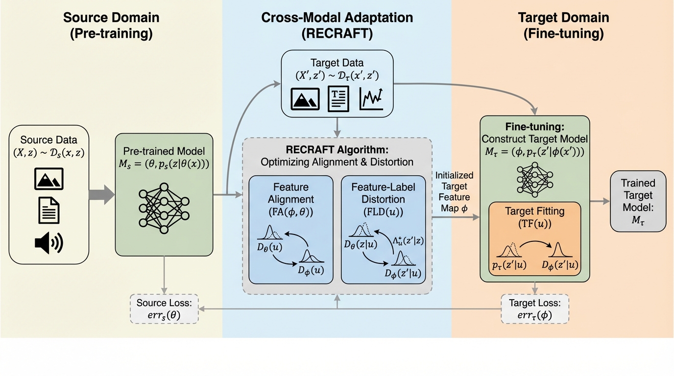 事前学習済みモデルを未知のデータモダリティに適応させるクロスモーダル・ファインチューニングにおいて、特徴量のアライメントとターゲットへの適合の間の理論的な相互作用を解明し、汎化誤差の境界を定義する新しい原理的フレームワーク「RECRAFT」を提案した。