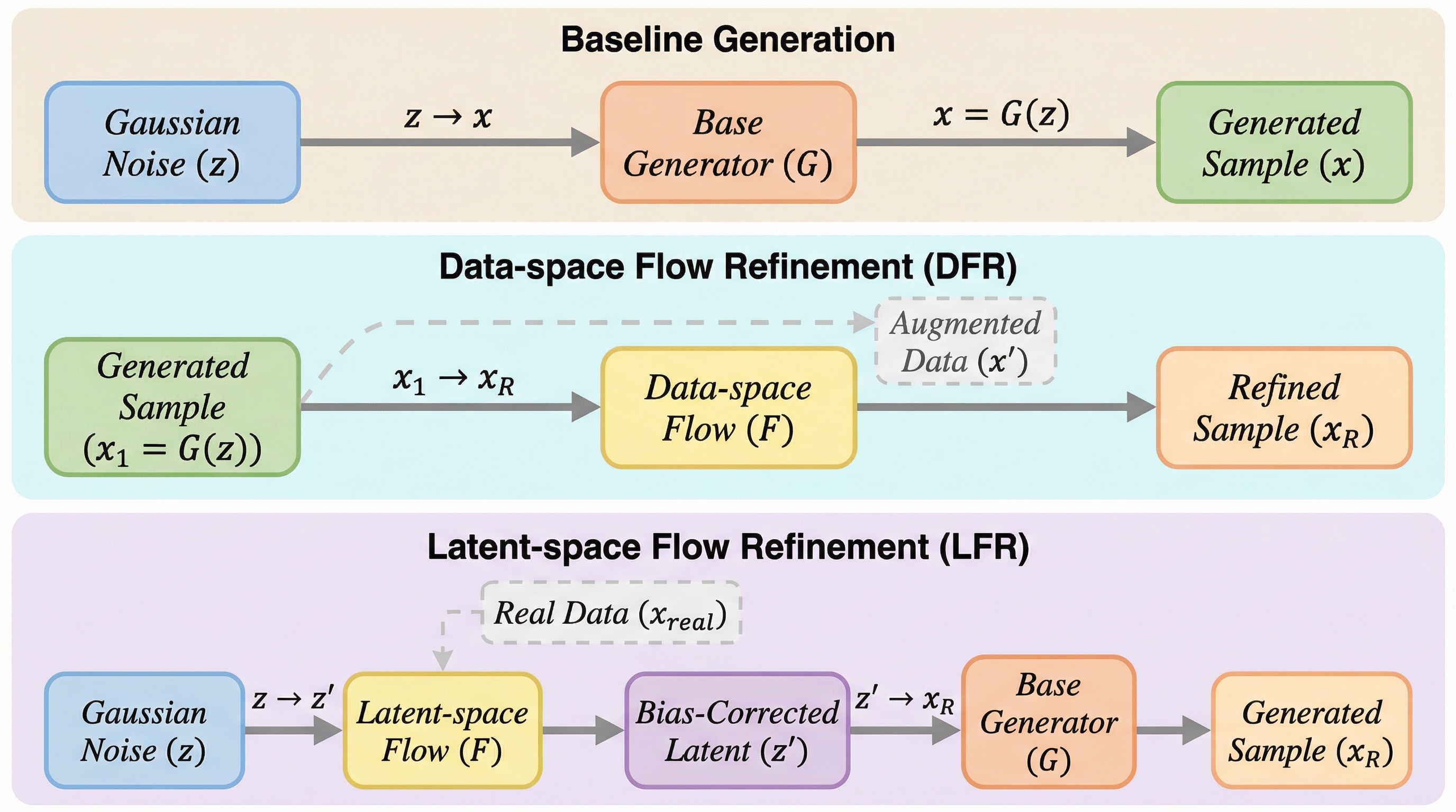 拡散モデルやフローベースモデルが抱える、訓練と推論の乖離に起因する系統的な生成バイアスを、推論時のノイズ注入や多段階の再サンプリングを一切行わずに修正する新しいフレームワーク「Bi-stage Flow Refinement(BFR)」が提案されました。