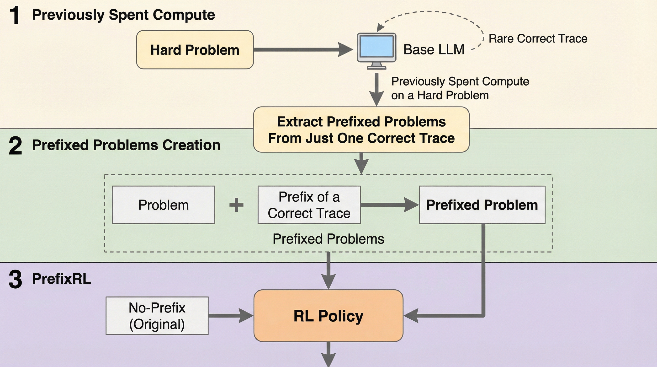 大規模言語モデルの数学やコーディング等の難問解決において、正解が稀なために学習が停滞する課題に対し、過去の成功トレースの冒頭部分を「プレフィックス」として与えることでオンポリシー学習を導く新手法「PrefixRL」を提案しました。